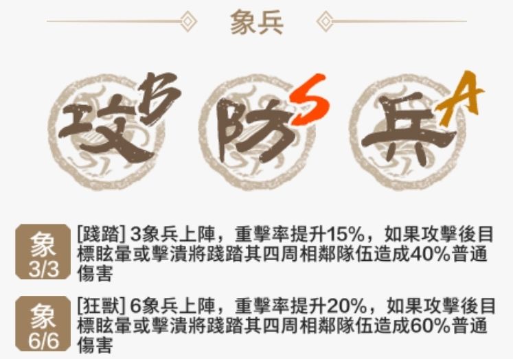 攻擊/血量一般。防禦較象兵弱。多配象兵/謀士/禁衛/方士。