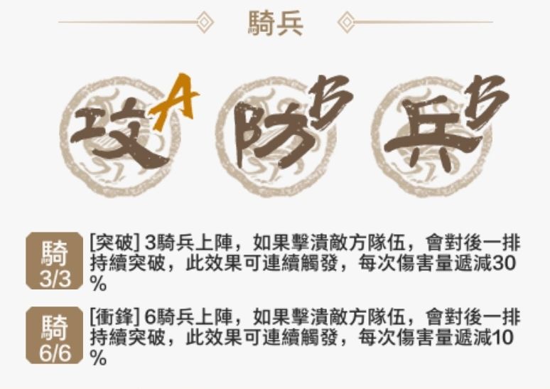 攻擊力強,防禦較槍兵弱,血量一般。最重要擊潰敵將。