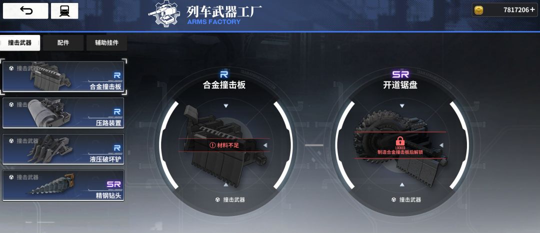 -功能评价:制造一些R和SR稀有度的【撞角装备】,不同【撞角】类列车装备可应对的敌人类型也不同,按自身需求查看制造即可。制造装备会消耗不少的【赴命奖章】/【铁盟币】/【各种材料】,前期误碰。