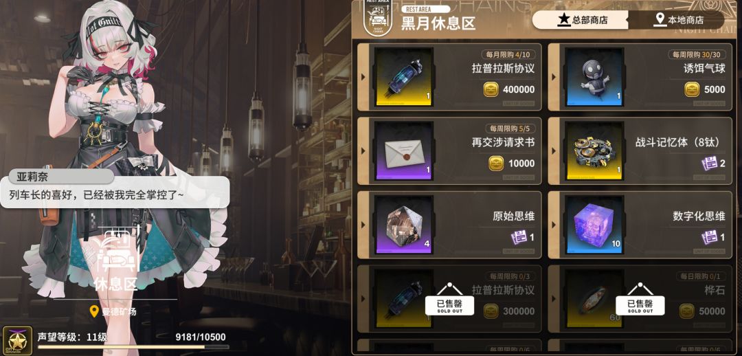 -【总部商店】世界共享购买次数,每日/每周/每月都能购买珍贵的抽卡道具。-【本地商店】每周一5:00刷新,各地商品都不相同,有概率刷出【SSR装备】和不同阵营的【装备箱】,还有洗词条的【自观测胶卷】等稀缺物品。-评价:【总部商店】是游戏中抽卡资源的主要获取来源,还有【棒棒糖】/【进货采买书】以及【追加注资申请书】等高实用性的道具,【本地商店】里偶尔也会刷好东西,值得列车长们每月投入1000万甚至更多的资金买下需要的商品。