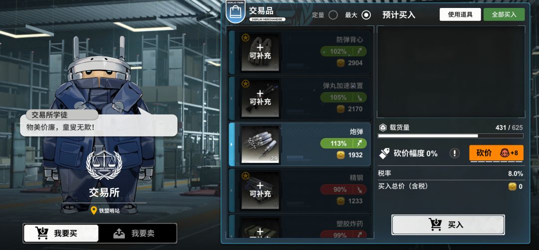 -功能评价:【铁盟哨站】的商品价格并不是很高,前四个商品价格还行,跑商利润是比【修格里城】多一些的。但是【防弹衣】解锁交易许可的投资额度是210万,前期根本投不起!太贵了!