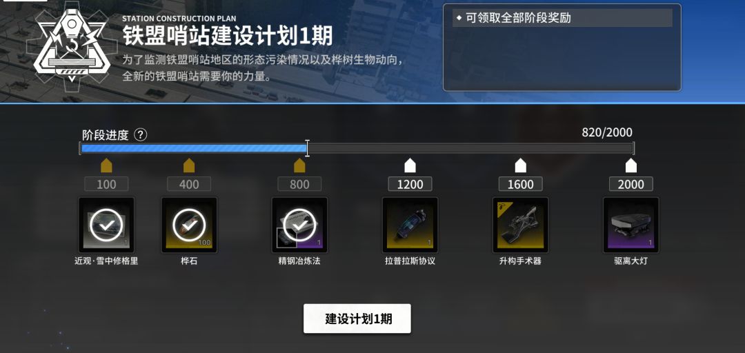 -【铁盟哨站】推荐刷【作战计划】拉到800建设进度拿【精钢配方】。由于刷满【建设进度】的过程十分耗体力,请各位列车长在有充足的时间或是将来出现更高级的【作战计划】时,再考虑把剩余的建设进度补上。