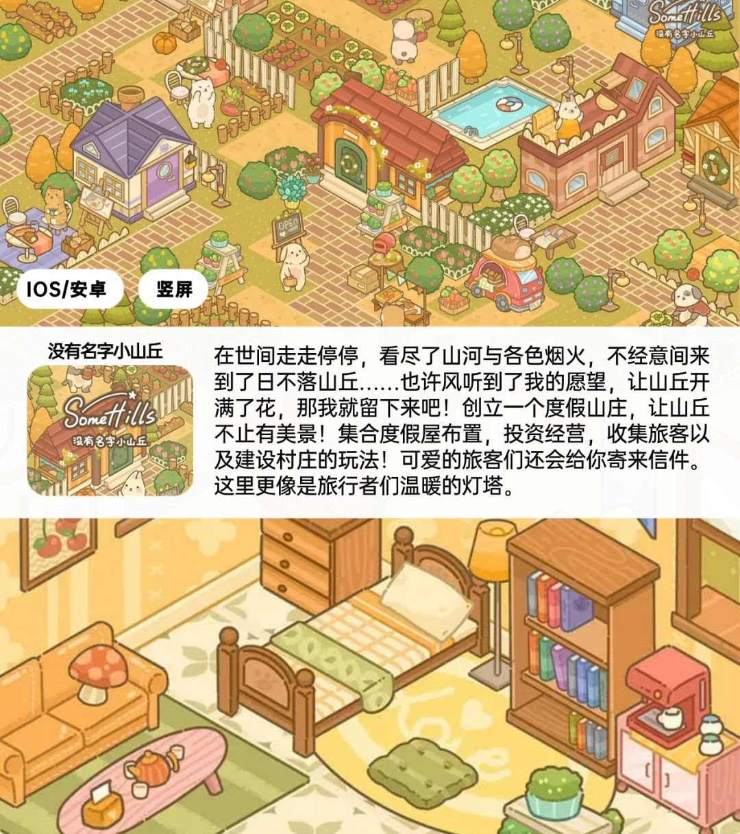 一眼就被画风俘获的游戏,在TapTap上已经预约太久了。(以前叫日不落山丘,后面经历了改名)目前还在开发中,希望早点上线啊!玩法上也是收集,建造并且经营山丘独家山庄,和你可爱的动物客人们更会发生各种各样有趣的事情哦!