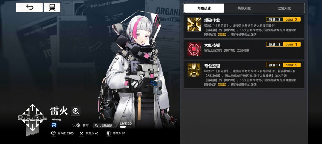 承伤/抽卡位:r雷火,外号炸弹姐,技能的爆炸物可以提供延迟抽牌能力,【引雷】可以辅助【撕裂】输出。