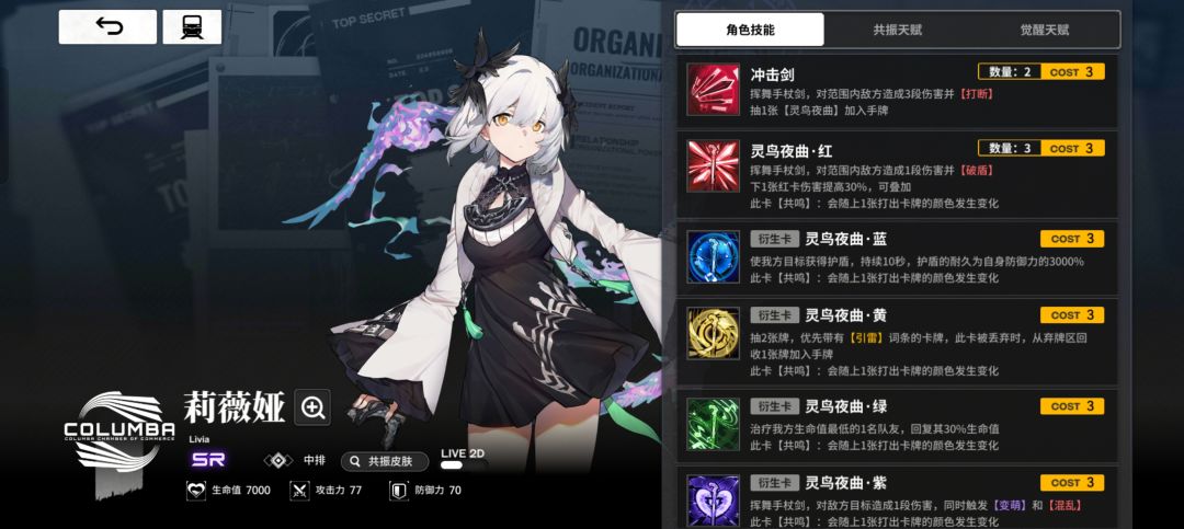 红卡/副c位:sr莉维娅,人手一只的女主,一身红卡的含金量,可以极大的加速大招的解锁速率。