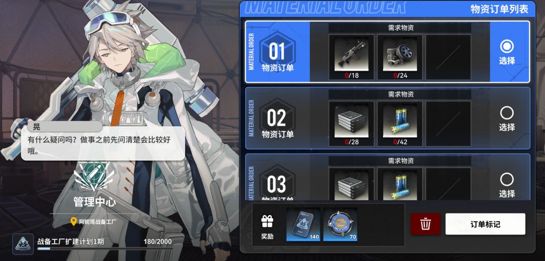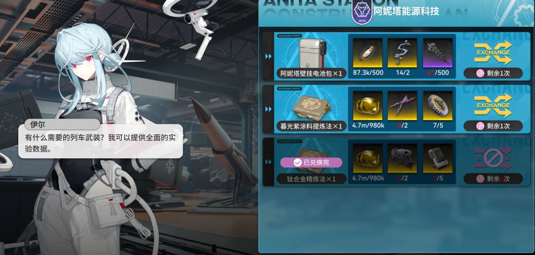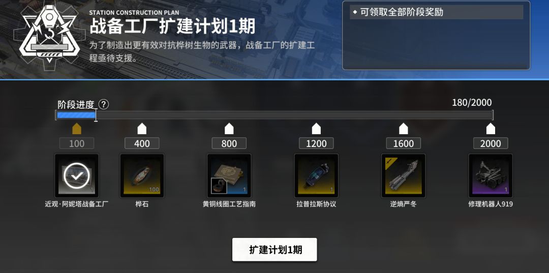 -【阿妮塔战备工厂】建设计划目前貌似有bug,刷作战任务不涨建设进度……在修复bug前只能靠【物资运输】涨到800进度拿【黄铜线圈配方】了,刷到1200进度拿拉普拉斯协议就可以了,之后进度的东西不是很重要。