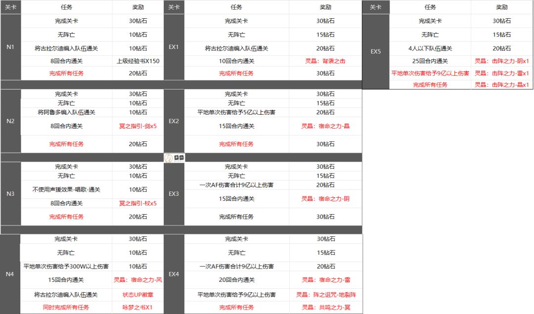 EX-1/2/3/5:搭档用提特拉-愈療之铃+里雷诺,第五关要求4人队伍,记得调整队伍