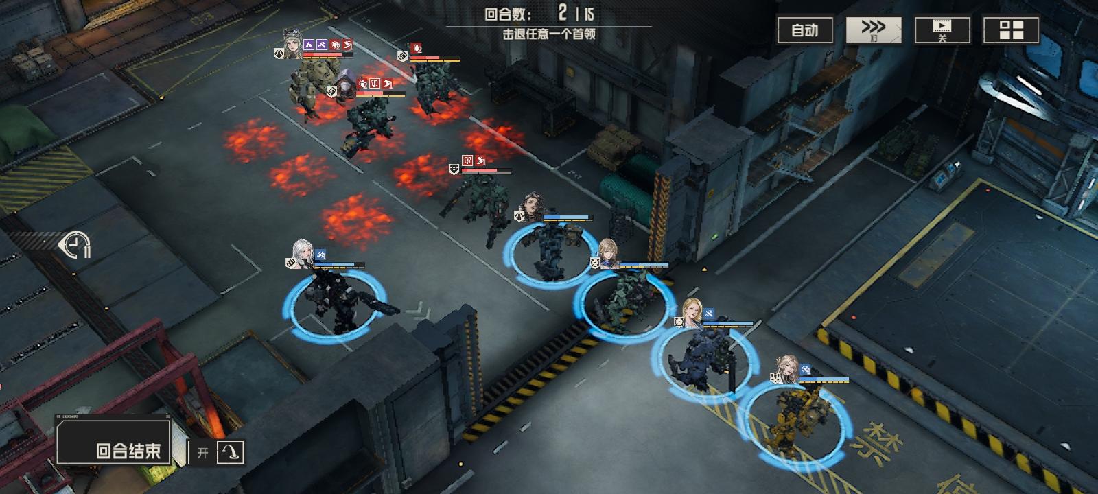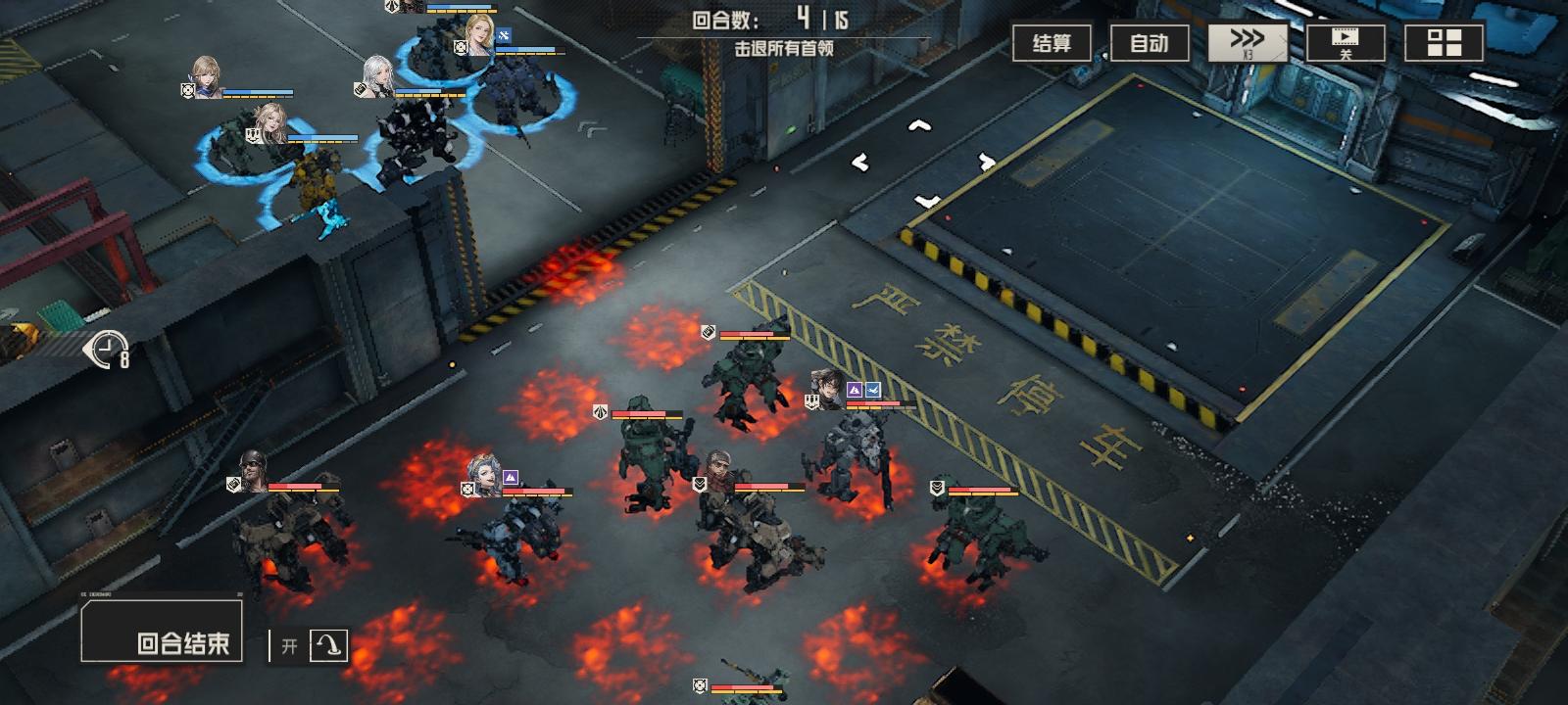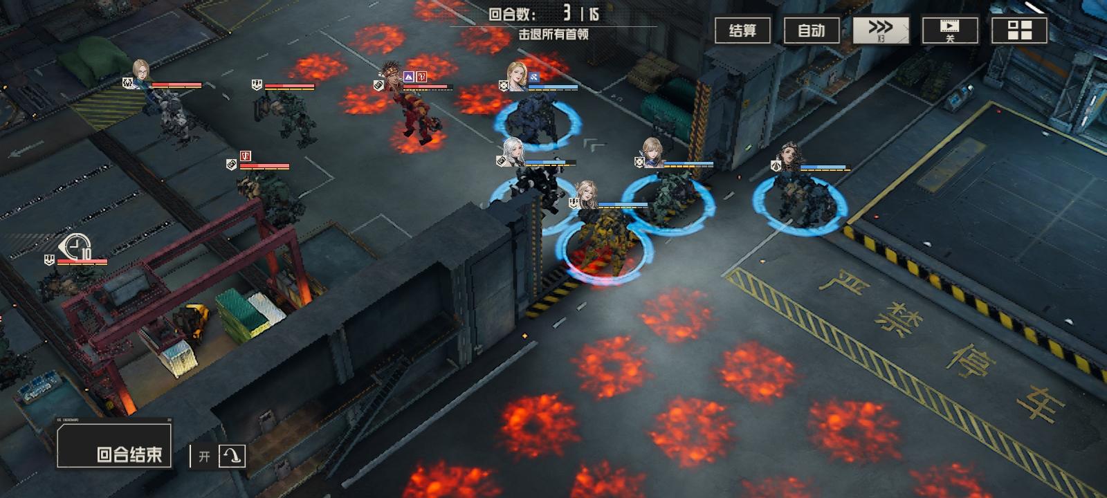 艾琳穿日努带漫天补缺地火1+16,西尔维亚和芙利达移动背包,肖尼穿马萨1+16,白月随便穿7+10(1+10也可以,白月打的次数不多,出斜角是为了提高输出),主要是开局要罚站后面要锁头。第四回合芙利达开负载,把射击BOSS推下面一格,肖尼通过走位串三次 ,俩BOSS都剩五六千血 ,白月和西尔维亚锁头,打不死也烧死了。