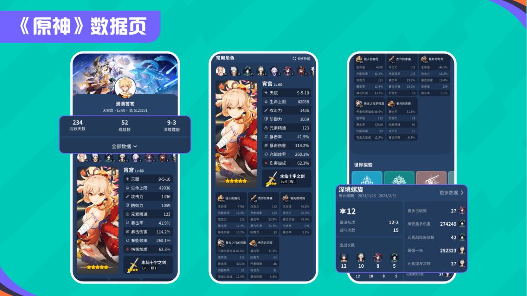 本次更新我们增加了《原神》的查询角色信息、数据概览、常用角色的练度情况,另外,我们把单个角色的属性词条,佩戴的武器装备属性练度详细展示出来便于查询,在游戏外也能快速浏览自己的展示柜角色数据。