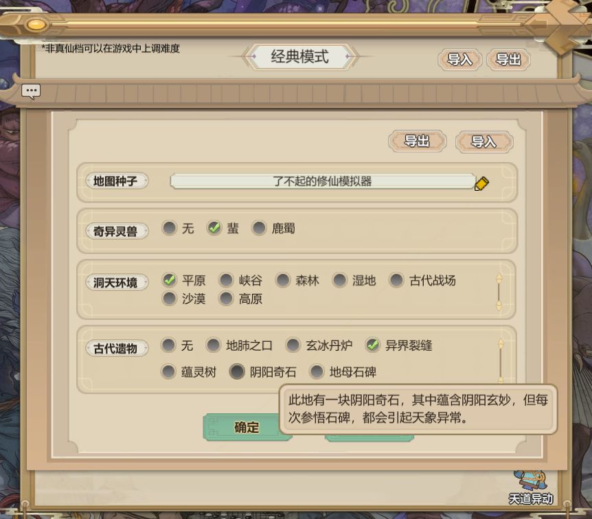 1:了不起的修仙模拟器。我最常用的地图种子!地图种子就是游戏名字,三个巨银杏,两大片灵田,加上大量沃土,完美开局,而且名字也好记,不容易忘记!