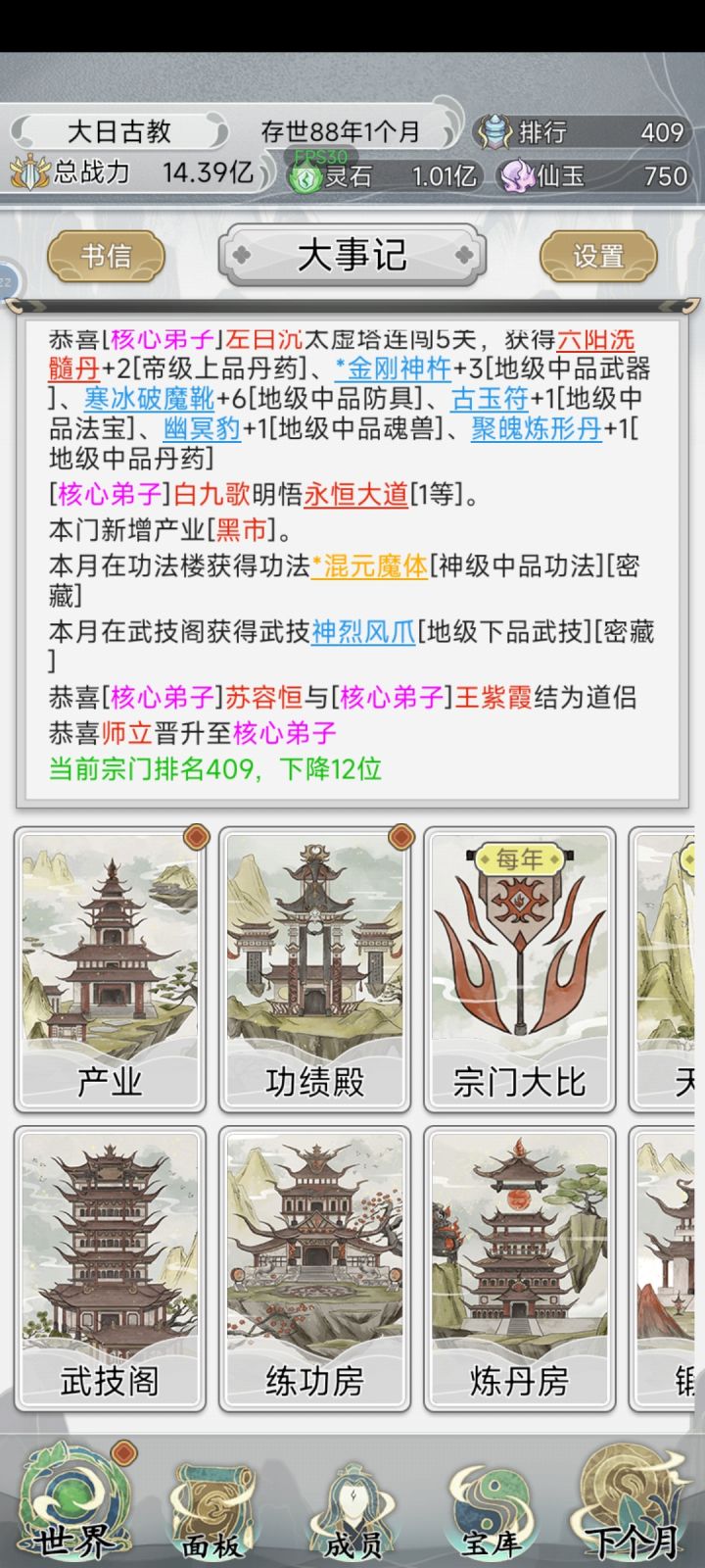 只能说肝了一天都快肝不动了,基本上灵石怎么都花不完,所有建筑都升满了,满建筑,满弟子,但是一天到晚都在点,我是真的累,差点连班都不想上了,后面就已经是每天下一个月,等大比就行了,其他诸多的类型玩法加的战力不多,我点一个下一个月就自动涨300万战力,大比一下就有一千多万,
