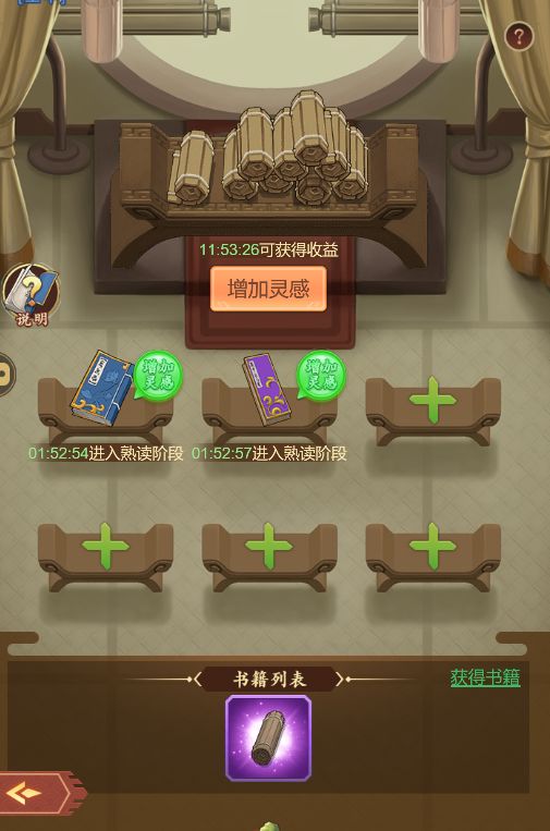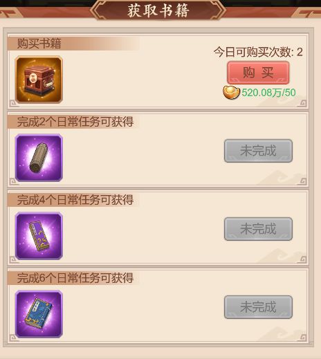 书院共有6张书桌,可以同时学习6本书,书籍可以通过完成每日任务或者消耗货币进行购买