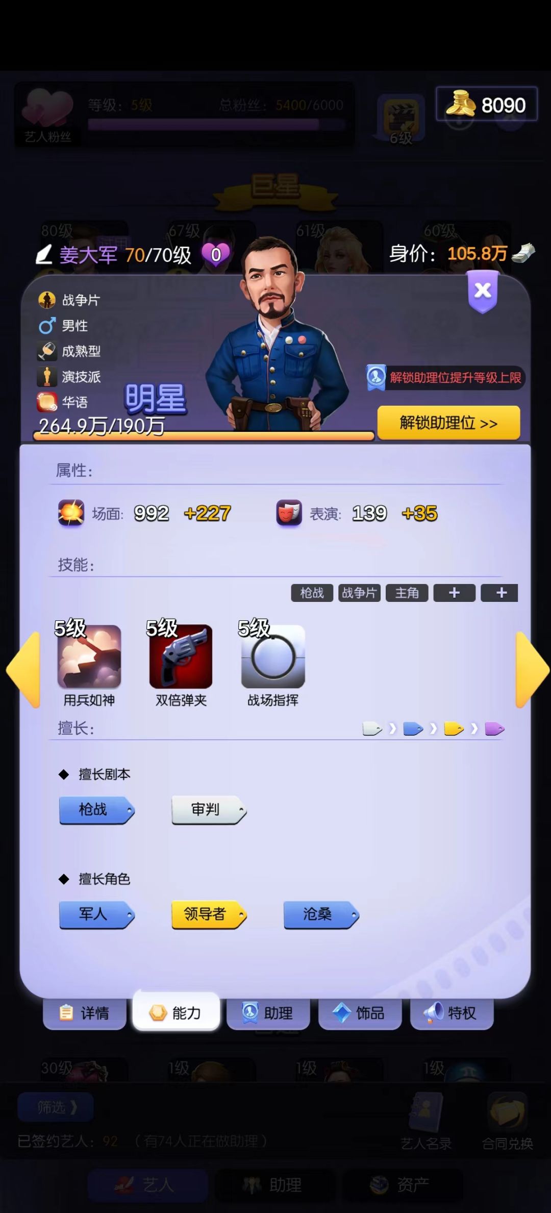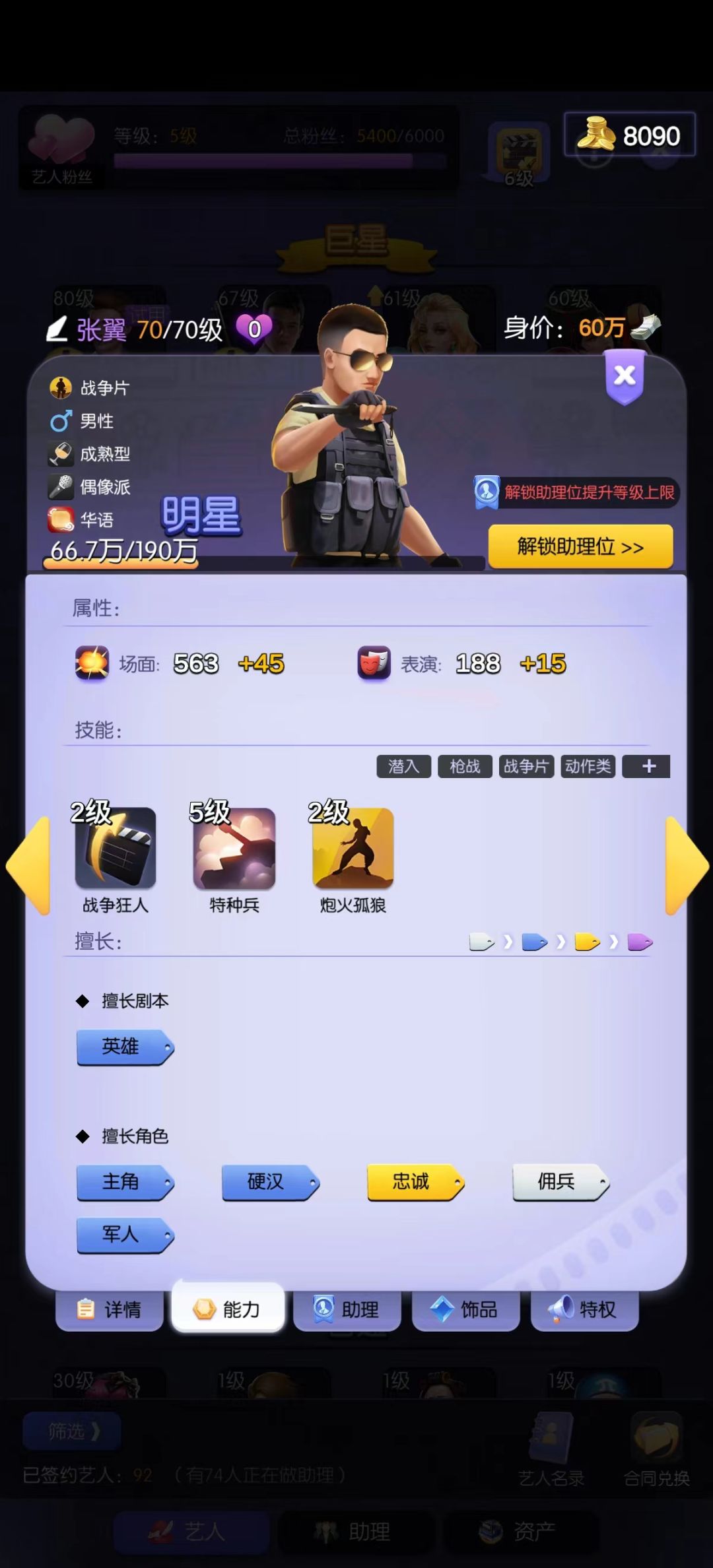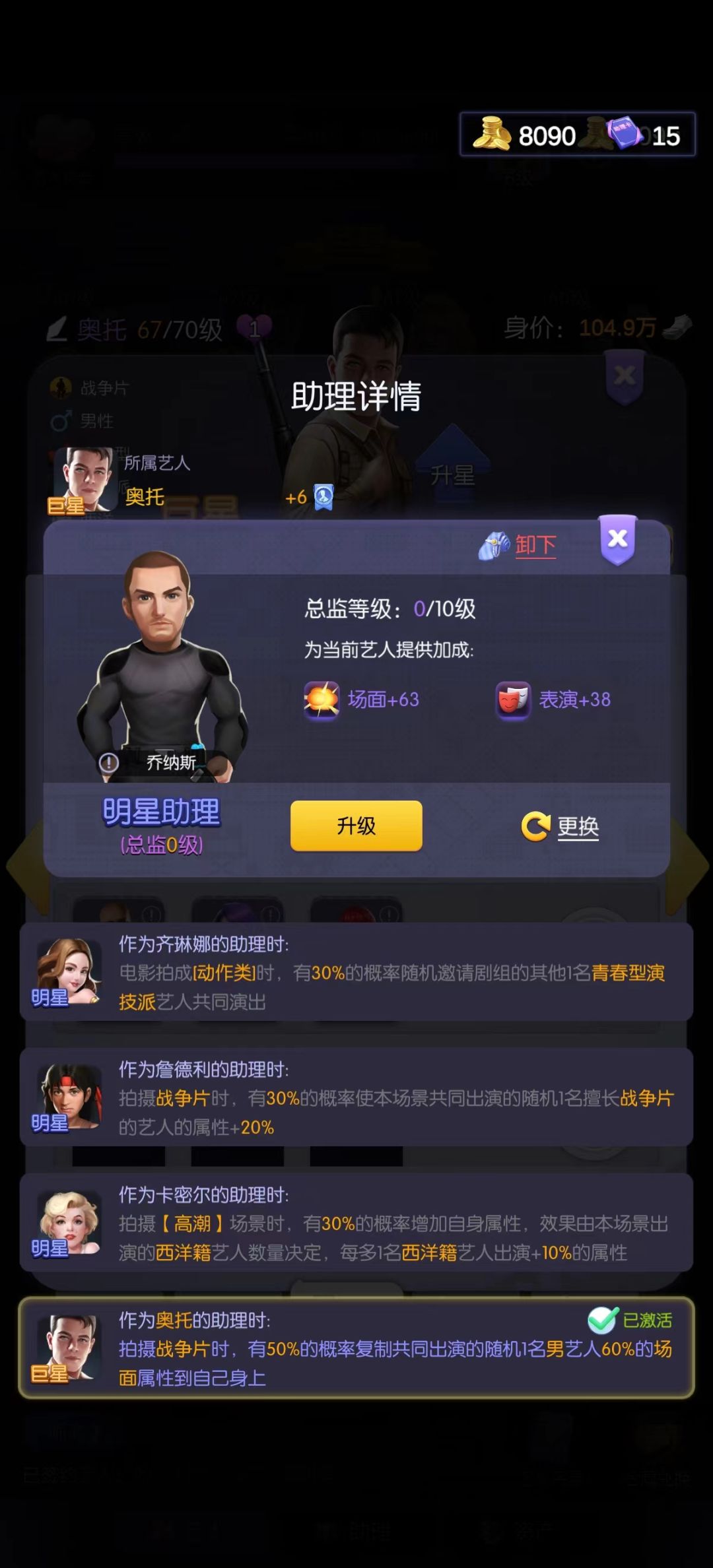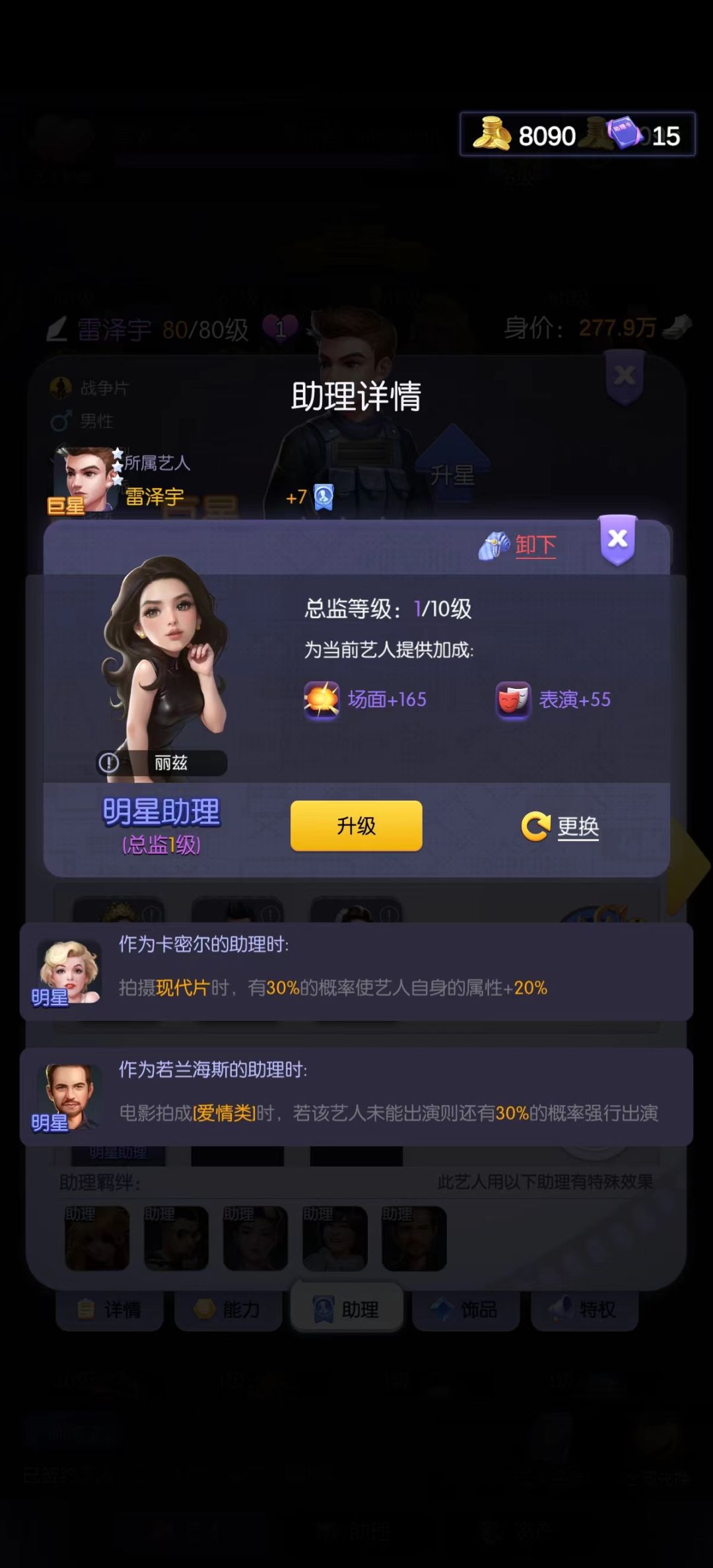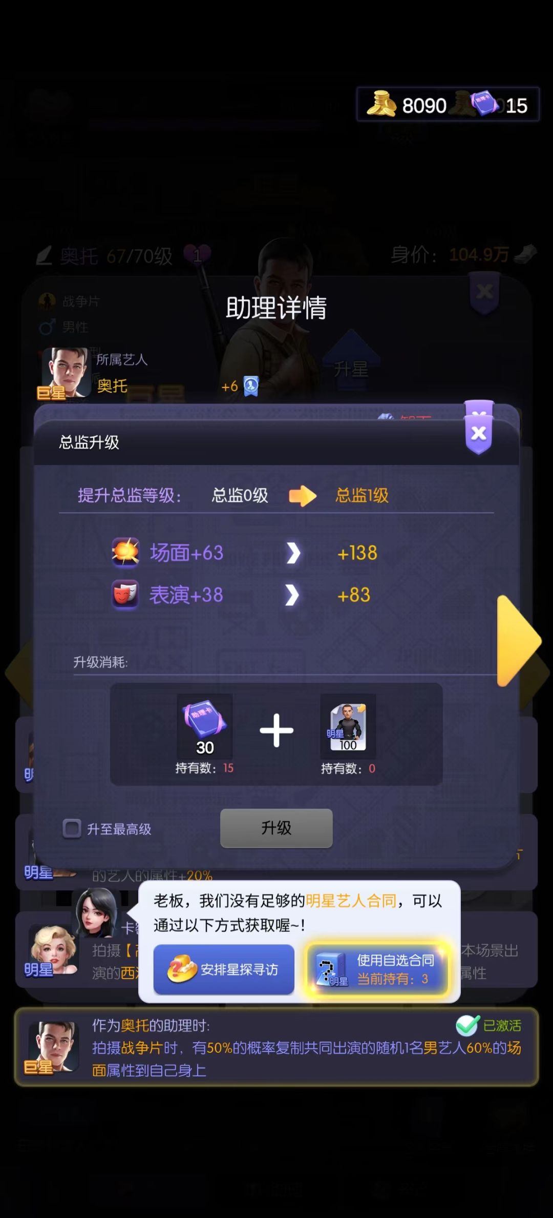 由于1级总监助理和0级总监助理属性提升非常大,因此需要处理好助理卡和合同之间的平衡。到总监0要50张助理卡,总监0到总监1需要30张和一个合同。165+55,63+38,差不多总监1提供的属性合计是总监0的两倍,在助理格子有限的情况下,全部总监1是后续的标配。所以前期只留重要龙套,其他的明星全部助理总监0起,核心演员全部总监1。总监1到总监2性价比低,前期不需要考虑。