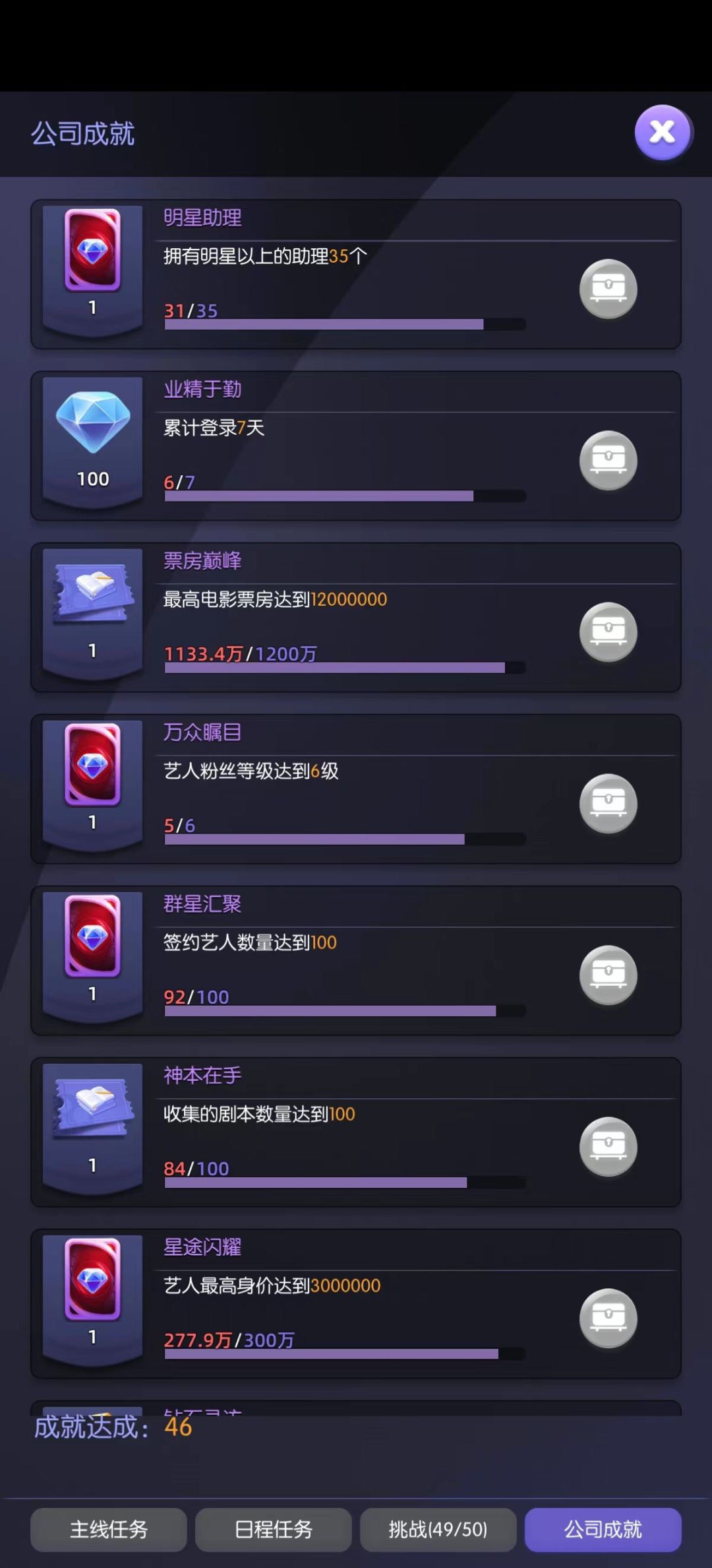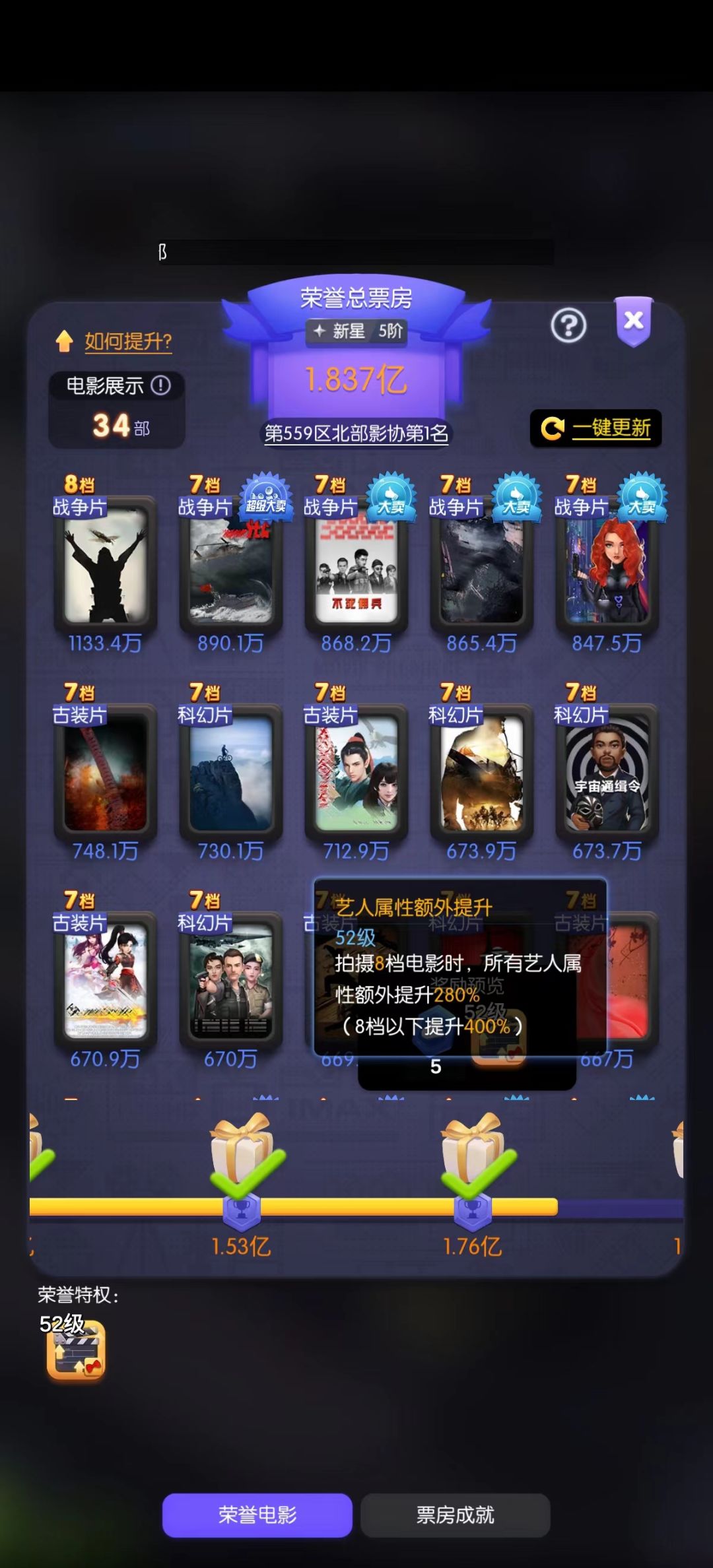 看论坛很多帖子说极限4天破8,我随意玩的没去试,慢慢累计荣誉室票房,这个总票房对于拍片有加成也有压制。总票房不够高时有压制,达标了就有正常加成。很多玩光搞演员,不搞总票房导致冲档很难。