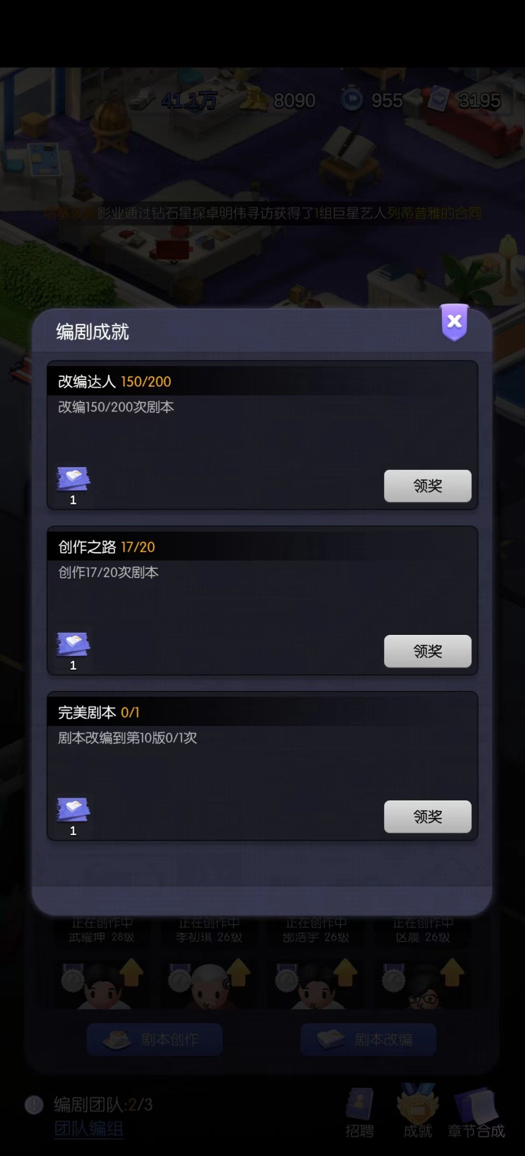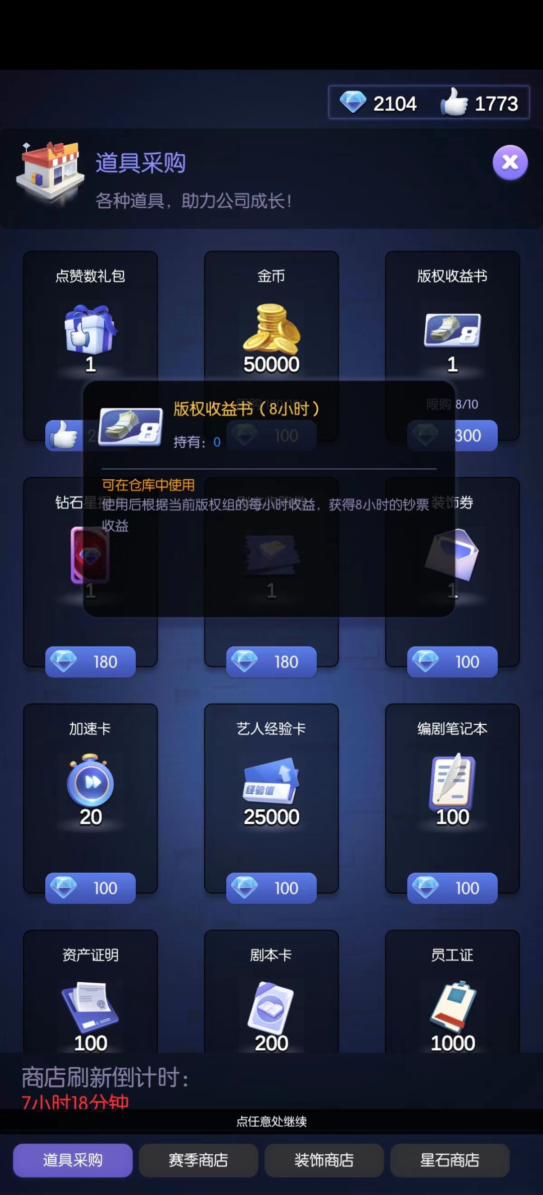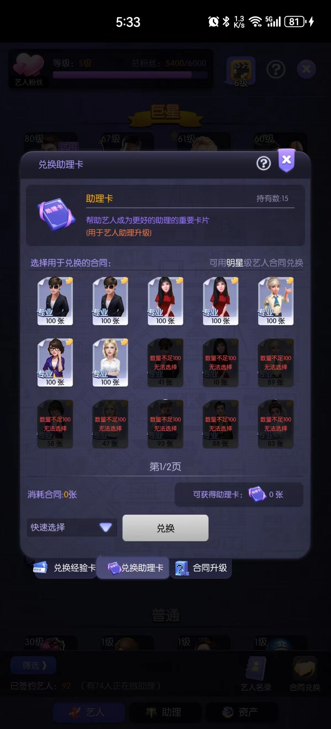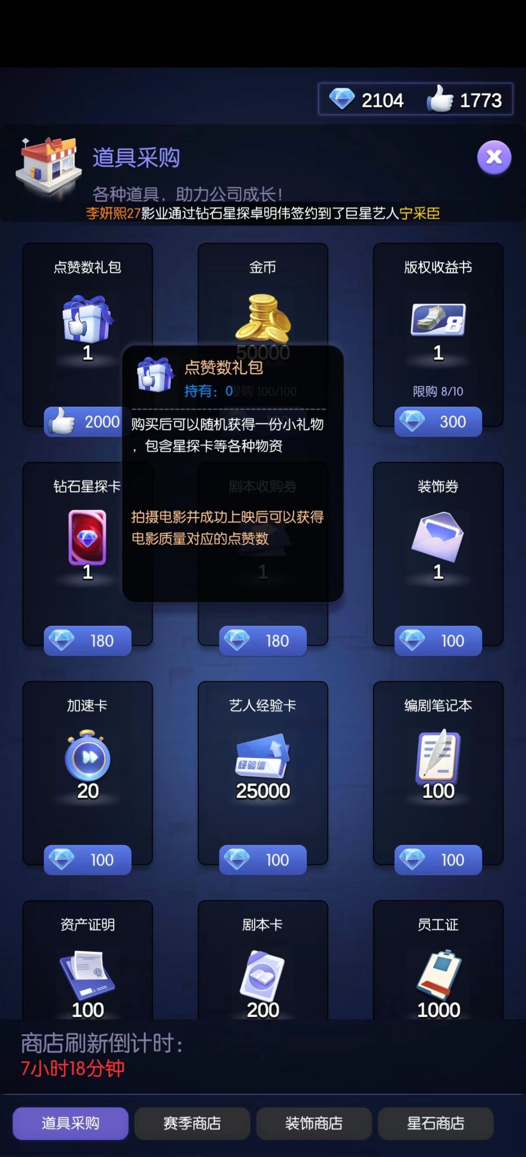 下面来说物:剧本、合同、助理卡、经验卡(不建议合,多拍片子给经验也可以重置经验满级溢出演员,我玩了6天目前还没遇到缺口,主要制约来自金币,没那么多金币也就不需要那么多经验卡了)