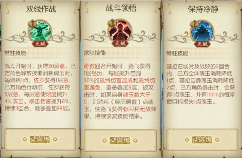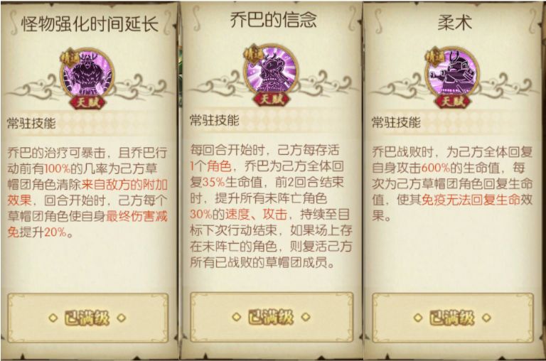5.乔巴的信念:该天赋的关键在于对复活机制的理解,前两回合结束时,如果场上存在未阵亡角色,则复活己方所有已战败的草帽团成员。经过天梯实战,该机制的正确理解是复活能持续两个回合,也就是说,如果第一回合己方有草帽团成员战败离场了,第二回合乔巴能复活第一回合战败的草帽团成员(存在未阵亡角色),同理,在第二回合离场的草帽团成员,也会在第三回合复活(存在未阵亡角色)。