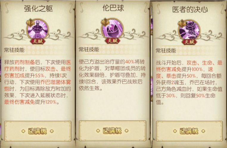 1.强化之躯天赋:第一个回合释放主动技能药剂制备后,下一个回合释放主动技能,终结技能以及进入奥义延展后得到的增益效果都是不一样的,该天赋分别为队伍增强输出能力、清除负面效果以及提升乔巴自身坦度。该天赋也向我们提示了释放技能的顺序,先释放药剂制备,再根据战场情况选择用医疗药剂或者噬菌体雾炮。