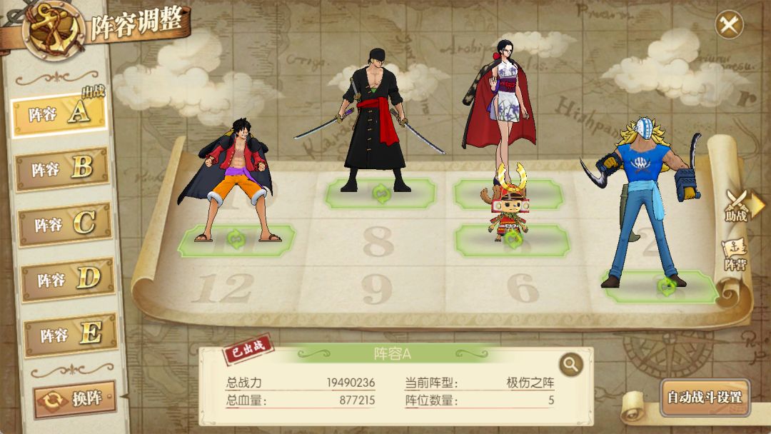 和之国路飞:携带三个主动技能或者两个主动技能和终结技搭配全体奥义。由于路飞的全体奥义附加30%几率的眩晕效果,在命中对面佐罗时有几率令其眩晕,跳过其行动回合,形成我方多打少的优势局面。