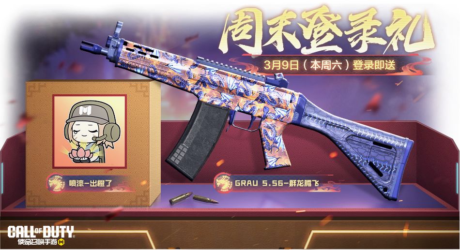 3月6日(明天)周末登录礼活动上线,战士们前往游戏内预约,并在3月9日(本周六)登录游戏,就能获得稀有级武器:Grau 5.56-群龙腾飞以及喷漆-出橙了,千万不要错过哦~