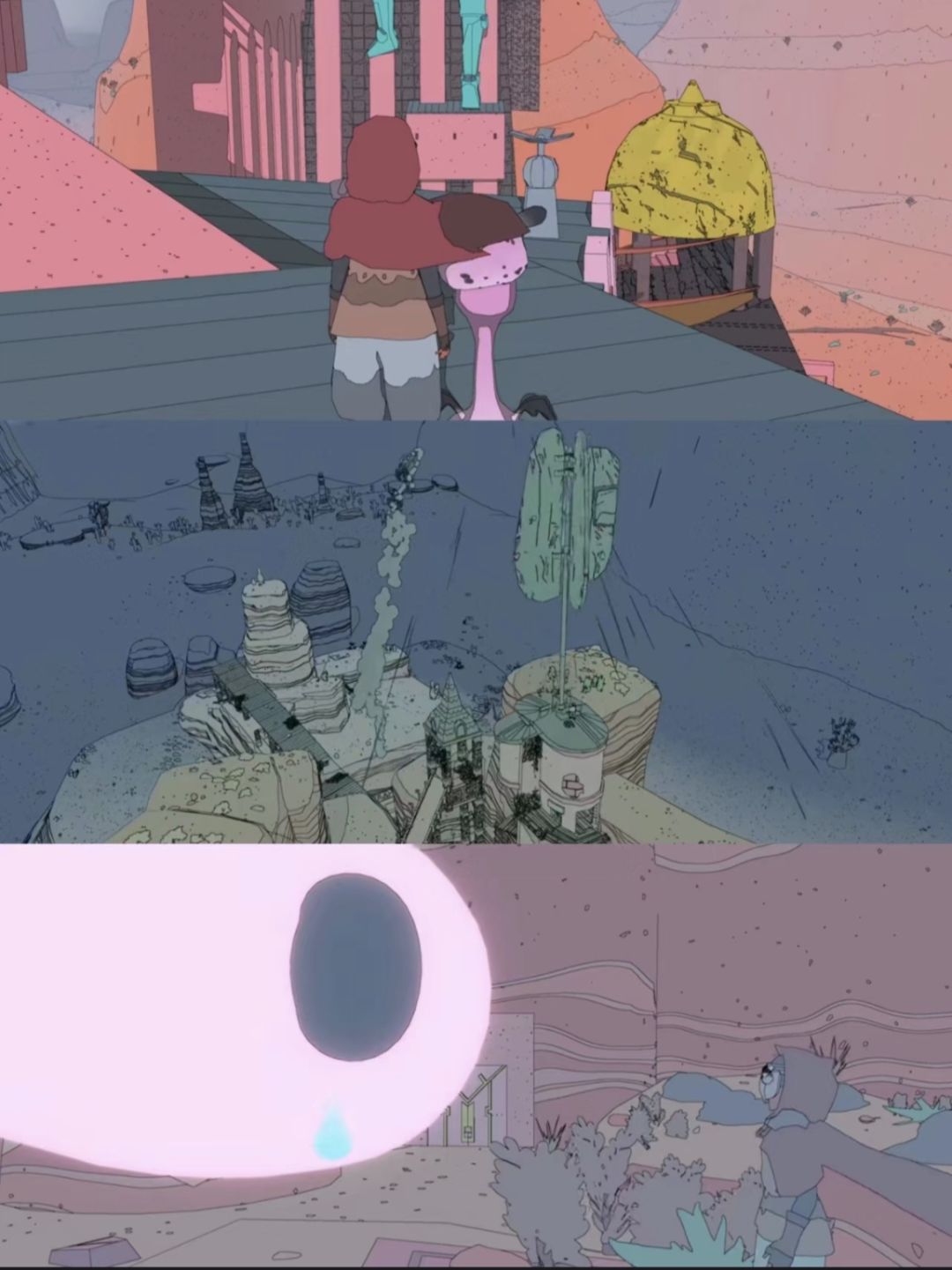 莫比斯美术风格的场景很独特,可以说是一个亮点,另外原声音轨由Japanese Breakfast制作,视觉和听觉都是享受。游戏中可以攀登滑翔开浮空机车,和npc 对话完成各种各样的任务,收集或购买不同的装备和物品,在开放世界探索冒险,不会死亡也不会失败,整体比较自由。