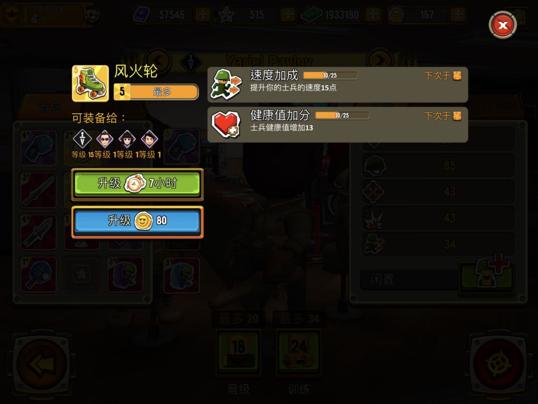 这些都可以在招募里刷到,15级25训的刺客就买回来放着,打架用,当备用兵。。也不用训。刺客大多用于pvp,刺客pvp的速度装叫风火轮,其实作用为零,因为虫洞和瞬移是无视对面速度的,开局就贴脸,我30速你一百速也是出不了手打aoe的。所以我没升这个速度装,这速度装和机枪的和炮手的一样,可有可无