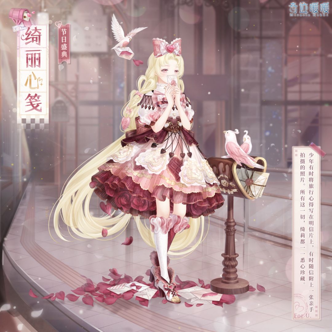 【绮丽心笺】含正常姿势与特殊姿势,特殊姿势上衣“浪漫伏笔”、“瑰恋之音”,精美可移动摆件“千里心念”、“缤纷心迹”、“专属心意”,海报展示妆容为“温柔守护”。