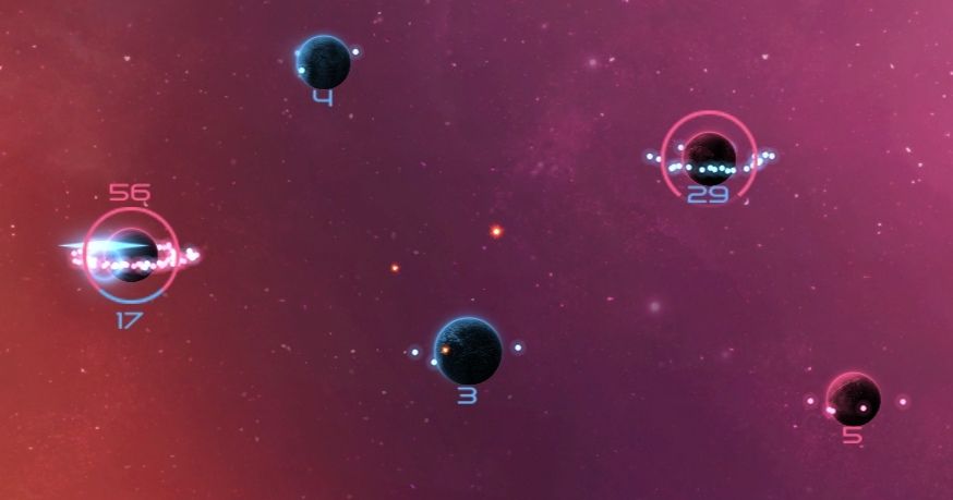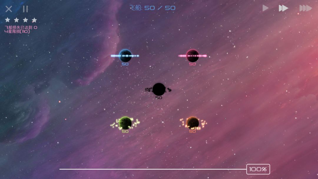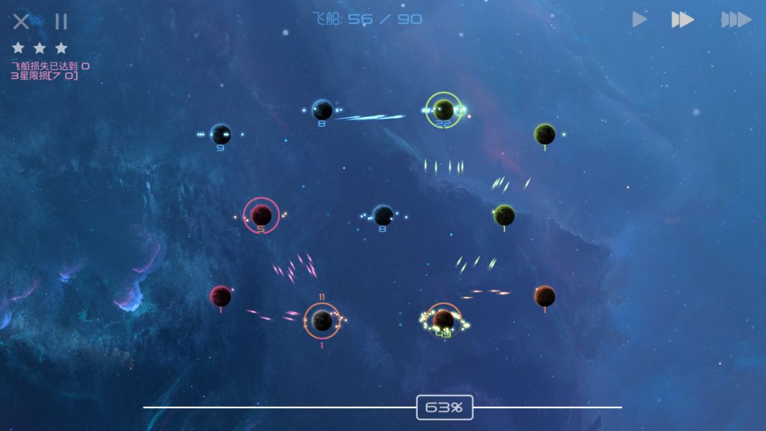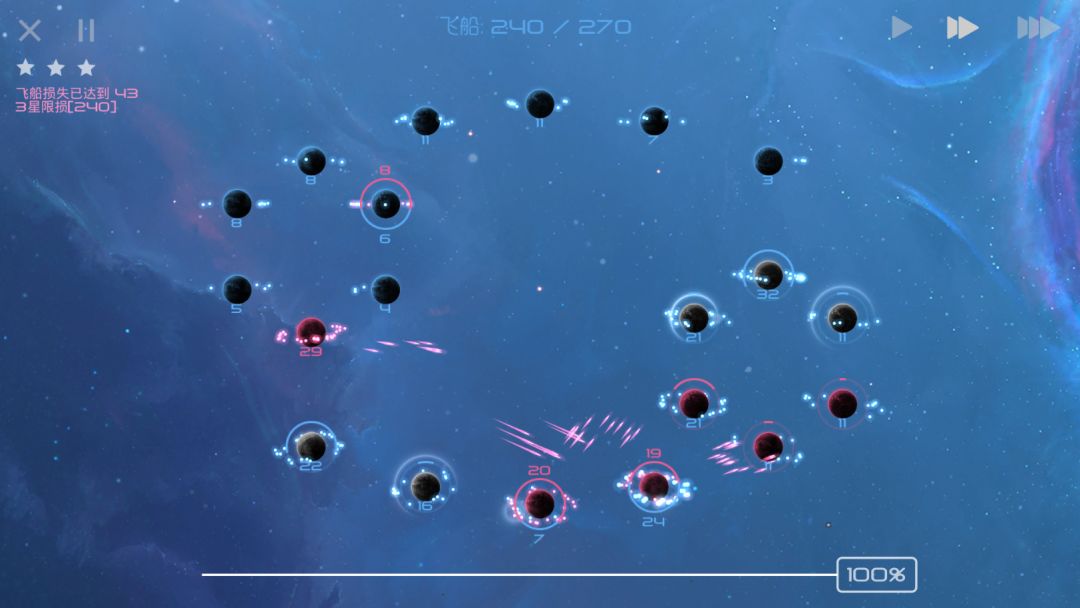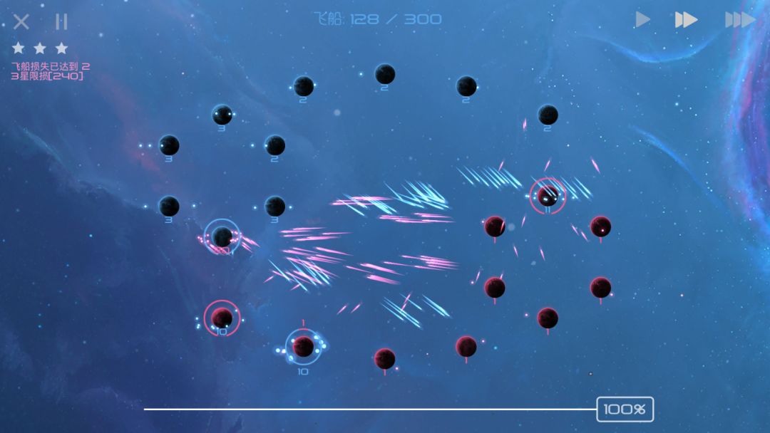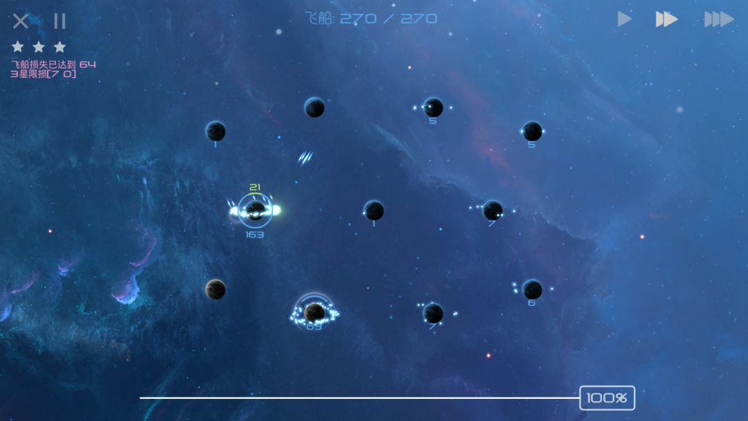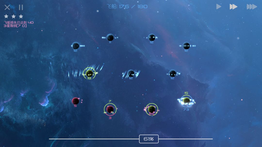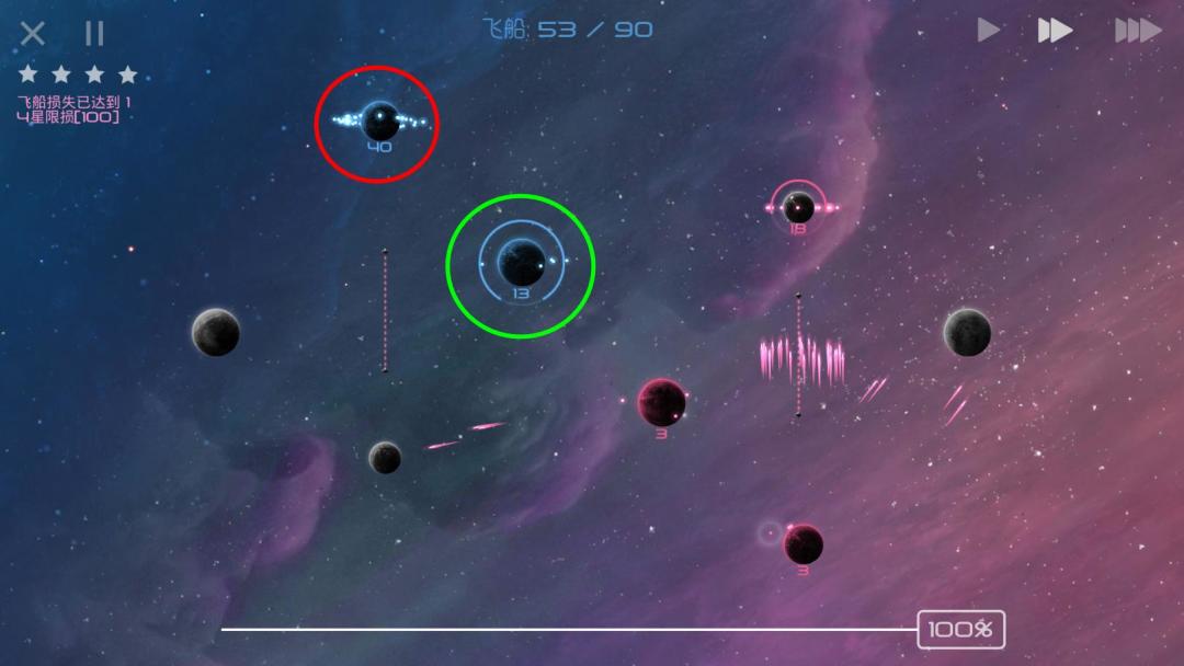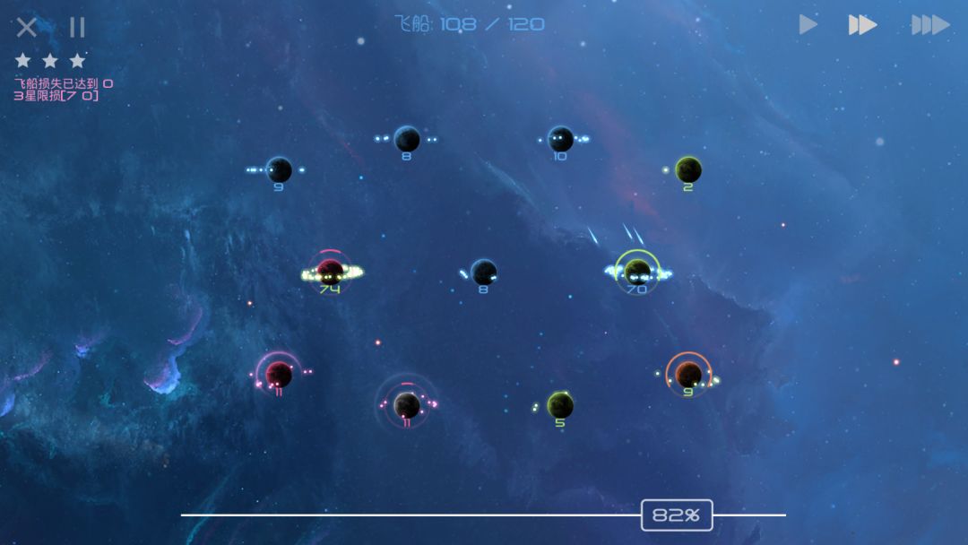 当你在正面战场上被AI击溃,只能在各个天体间抱头鼠窜之时,请安心躲避AI的进攻,等待其聚成一个大部队,而后我方剩余飞船再分兵快速发展,就可以摘取胜利的果实了!