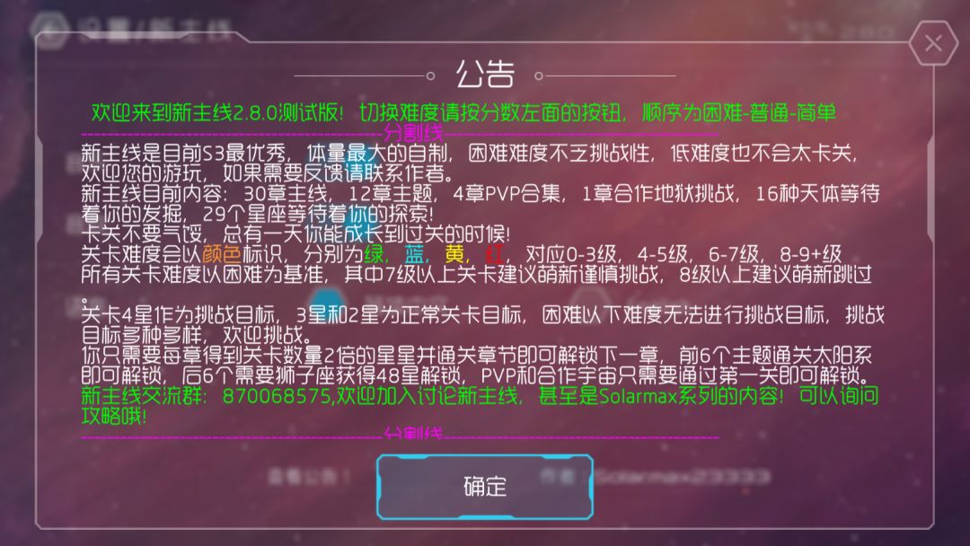 新主线是纯正的玩家自制版,而非任何官方内容的复刻。新主线的存在历史已经很长了,在三测版关服以前,作者就已经开始着手制作新主线,现在已经更新了31个星座,13个主题,共计556个关卡。新主线也一直走在时代前列,开创了大量新型制关思路、新天体、新的游戏模块和设计,等等,持续引领着s3自制的发展。