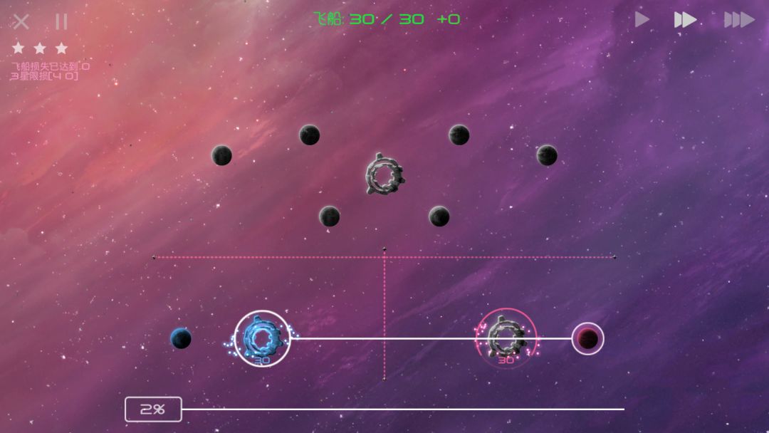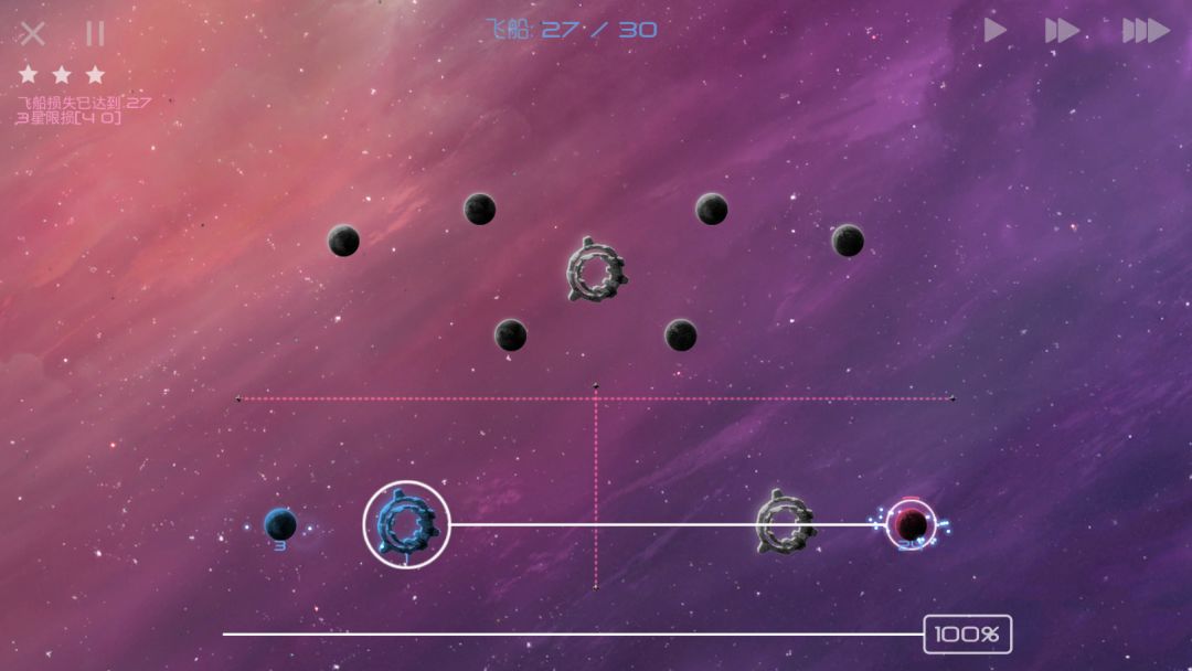 在上面,我们已经讲过,存在不会分兵的AI。如果你发现一个关卡的AI不会分兵,且这关的地图中炮塔等天体较少,也就是存在可以“木”的空间,那么“木”可以作为你通过这个关卡的最后手段: