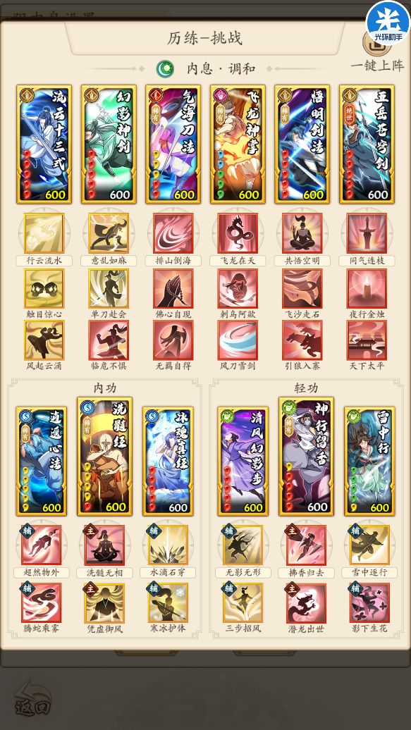 配招细节:影下看你喜好也可以换成降龙降世,快速拉条触发率收益也高。单刀赴会卡在幻影那可以保证吃一步登天时候能吃满回血,增加点肉度。这套拉条尽量平均就是为了固定combo之间的搭配,先后手都基本能联动。内轻方面,洗髓神行潜龙影下基本全方位防住还提供回春+回血增加肉度,还增加了对四系的抗性,逍遥清风雪中的拉条又和洗髓绝配,可以高频率触发。