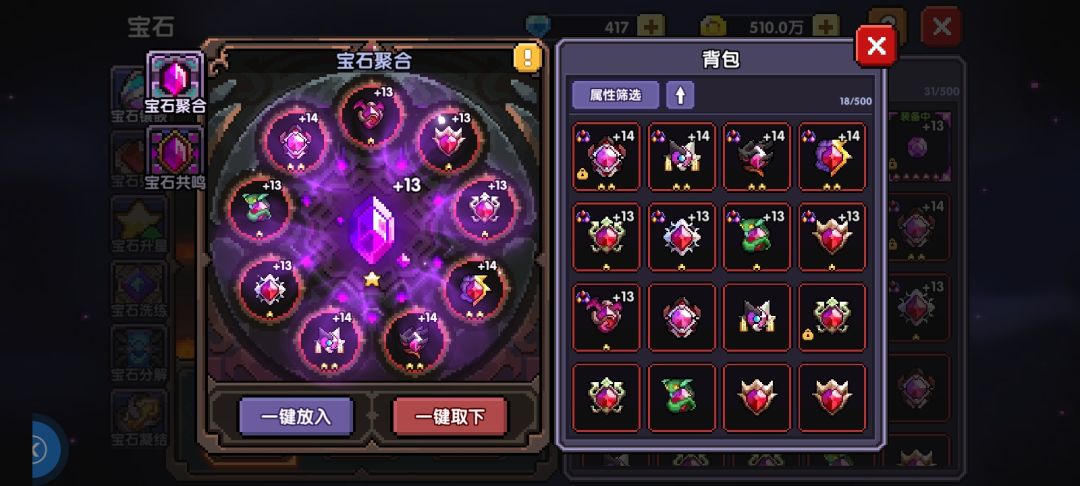 前期:紫白蓝宝石过度后,挑选好属性的橙宝石升到满星不升级,丢到共鸣区,聚合区的宝石不升星只升级,红宝石全部都留着,不要分解