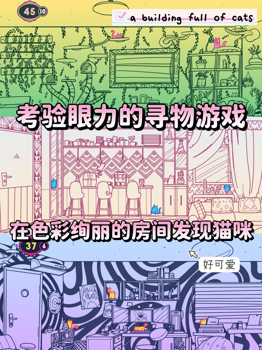 这是一款考验眼力的游戏 在各式各样色彩绚丽的房间找到猫咪🐱 猫猫真的好可爱~