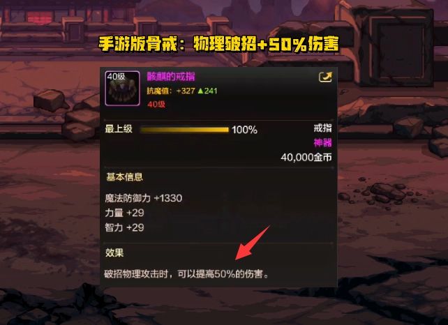 但“骸麒的戒指”有一个特殊效果:破招物理攻击时,可以提高50%伤害!要知道隔壁家鼎鼎大名的“无影剑”,也才附加30%伤害而已,所以把“骨戒”称之为版本第一神器可以说毫无问题。
