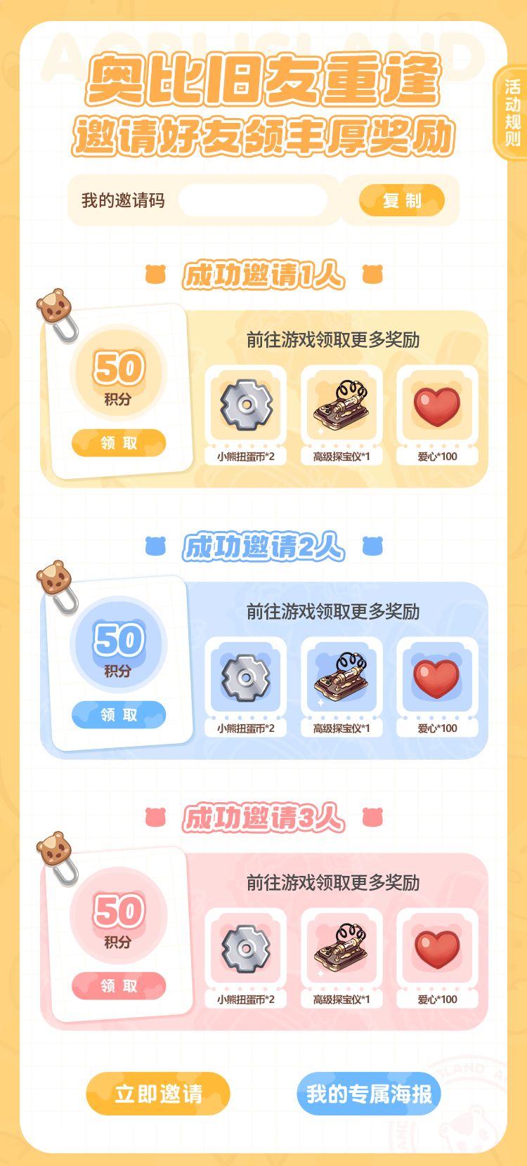 1.在「旧友重逢」活动中成功邀请好友,可在游戏内领取获得小熊扭蛋币、高级探宝仪、爱心奖励;