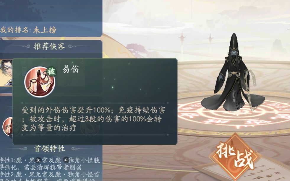 针对“受到的外伤伤害提升100%;免疫持续伤害;被攻击时,超过3段的伤害的100%会转变为等量的治疗”这个攻略方向相当简单,上个3段以下的侠客就好了,外伤的伤害增加(地球人都懂),而且被动伤害不算多段,这个就来了第一个思路侠客风越今朝(官方指定,不解释),下了怒招的道运雷小虎(必须下怒招,一个嘲讽死一片,主打一个谁上谁死)。