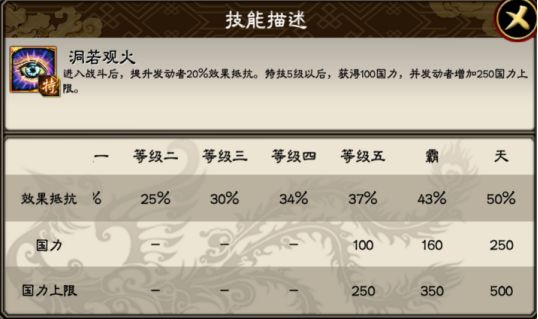 3.特技-洞若观火,根据官方透漏,此次更新最终的是增加国力这个减伤属性,100国力=10%减伤,对真伤有效,洞若观火的技能除了可以增加抵抗外,还可以增加国力与国力上限,最高是500%国力上限。开场增加50%的减伤,即使是面对当前版本比较强势的枭姬-尚香也可以有效的进行遏制。