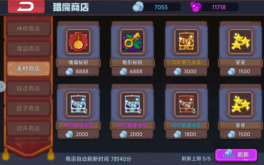 这个商店只有在完成猎魔之路任务的时候有帮助,由于徽章前期打的少,十分缺乏,毕竟只有打boss才会掉落,猎魔之路需要养成一个满级60级天赋的角色,可以适当在素材商店购买需要的徽章。星星不推荐买。