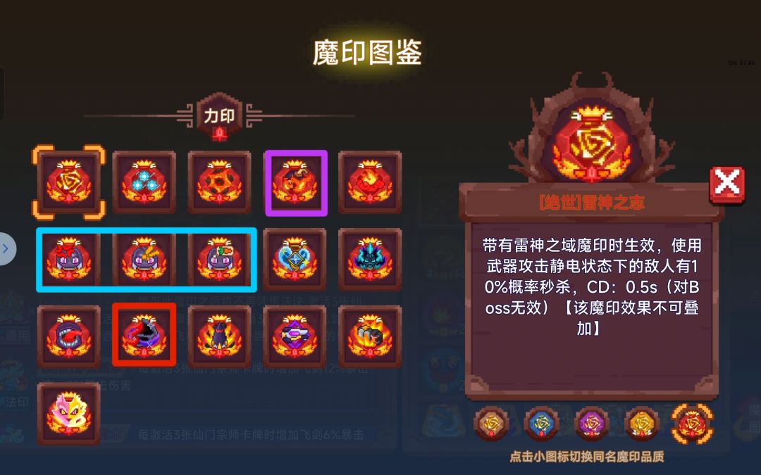 力印必买只有红色框内的镰刀,罪流派需要。如果开局买的第一个宠物是兔子,那蓝色框内的三个兔子专属魔印都买,练度越高,兔子伤害也越高。紫色框内为历练所需的炸印,需要有爆炸狂徒流派的卡组,星级不能低。可买可不买,冰印现在同理,不算刚需,根据自己情况选择。