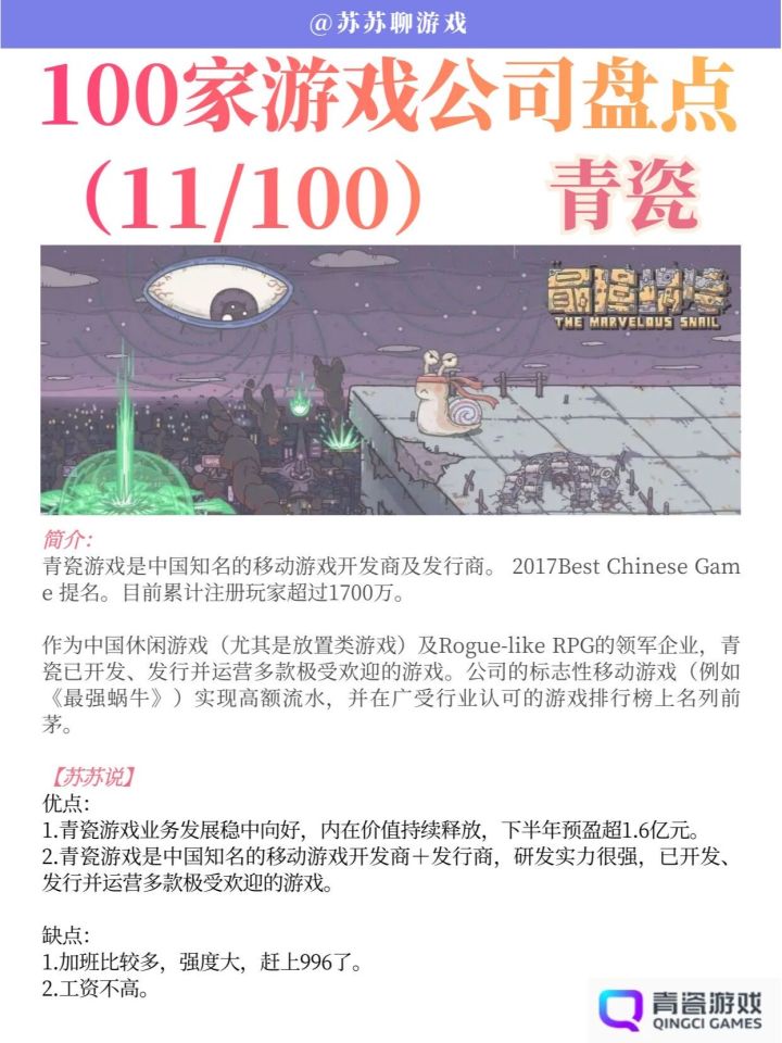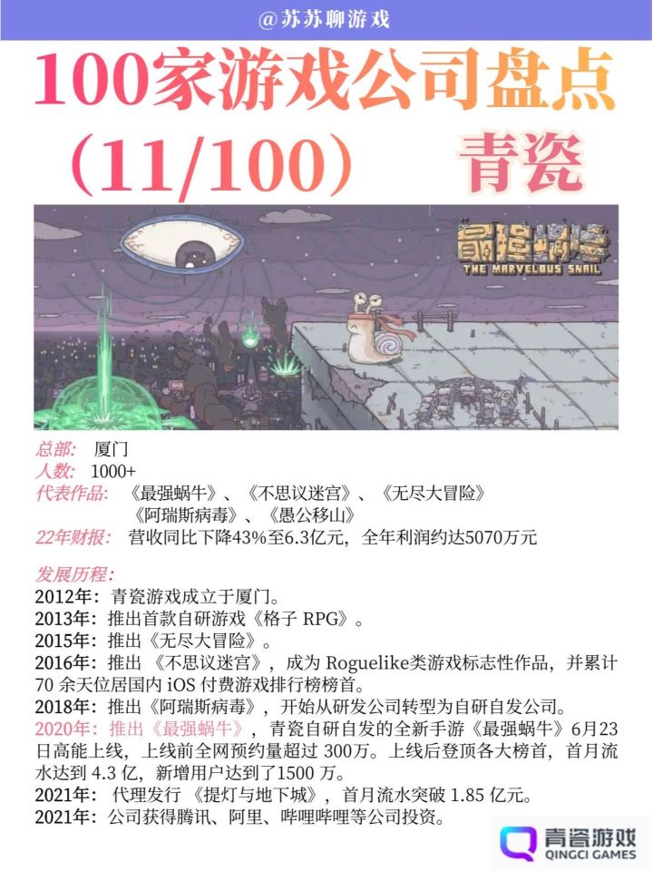 2020年,推出《最强蜗牛》,青瓷自研自发的全新手游《最强蜗牛》6月23日高能上线,上线前全网预约量超过 300万。上线后登顶各大榜首,首月流水达到了 4.3 亿,新增用户达到了1500 万。