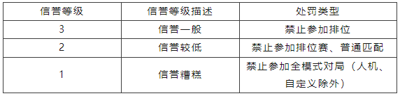 1、信誉评价降低直接将触发禁赛、禁模式处罚,信誉评价等级直接影响罚时长度