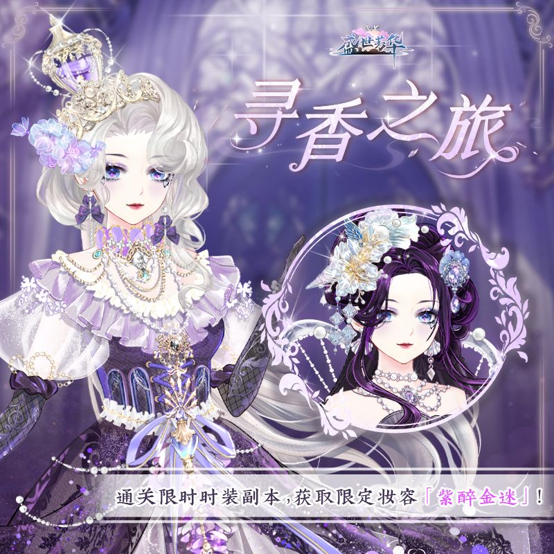 三月春回,柳姝邀你至蓬莱殿中,开启一段体验神秘香水的奇妙之旅。时装副本与限时时装卡池【盛筵香颂】同期开放,揭露崭新时装背后的故事。完成挑战可以获得限定妆容【紫醉金迷】!
