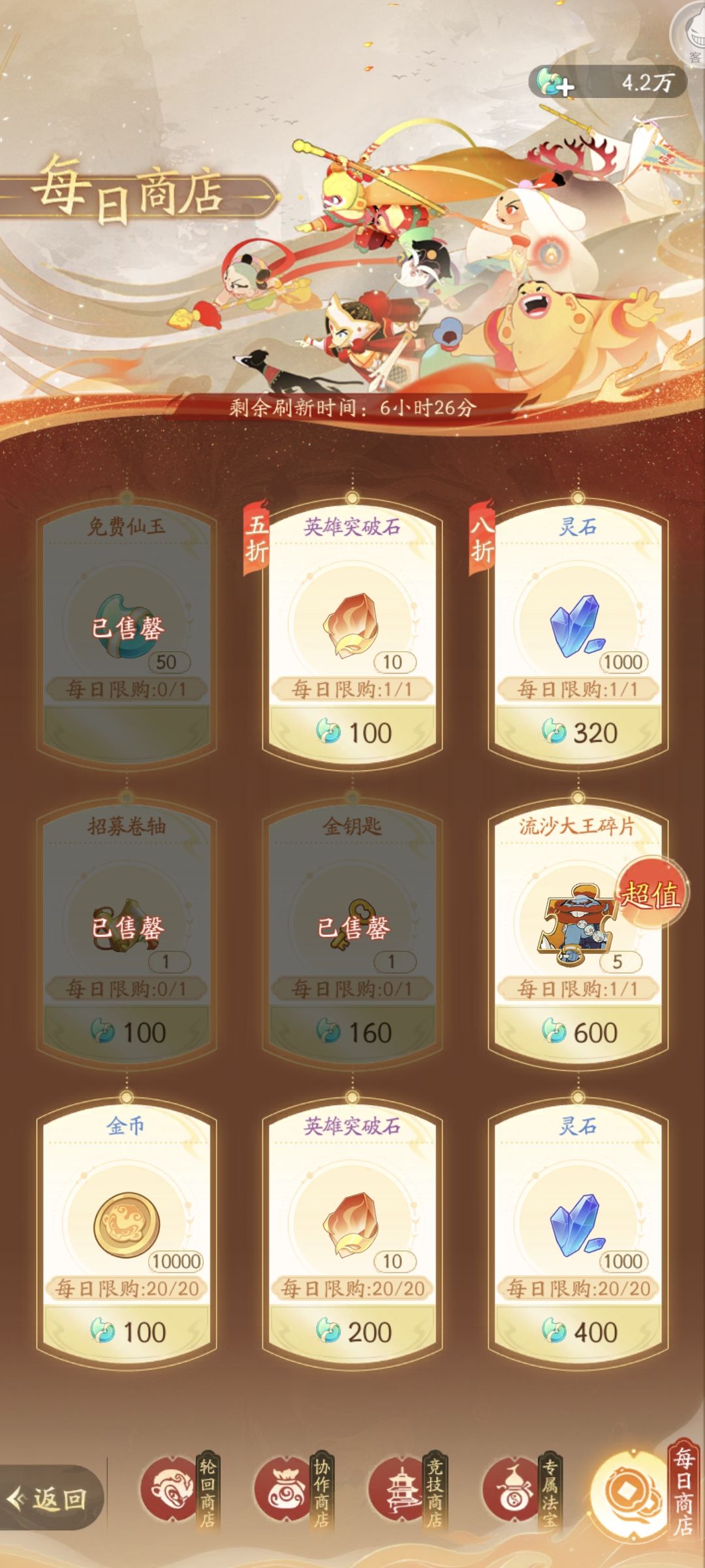 花费建议:换取金币,金币很缺,这七天每日商店五折的突破石,灵石换完,慢慢也会比较缺