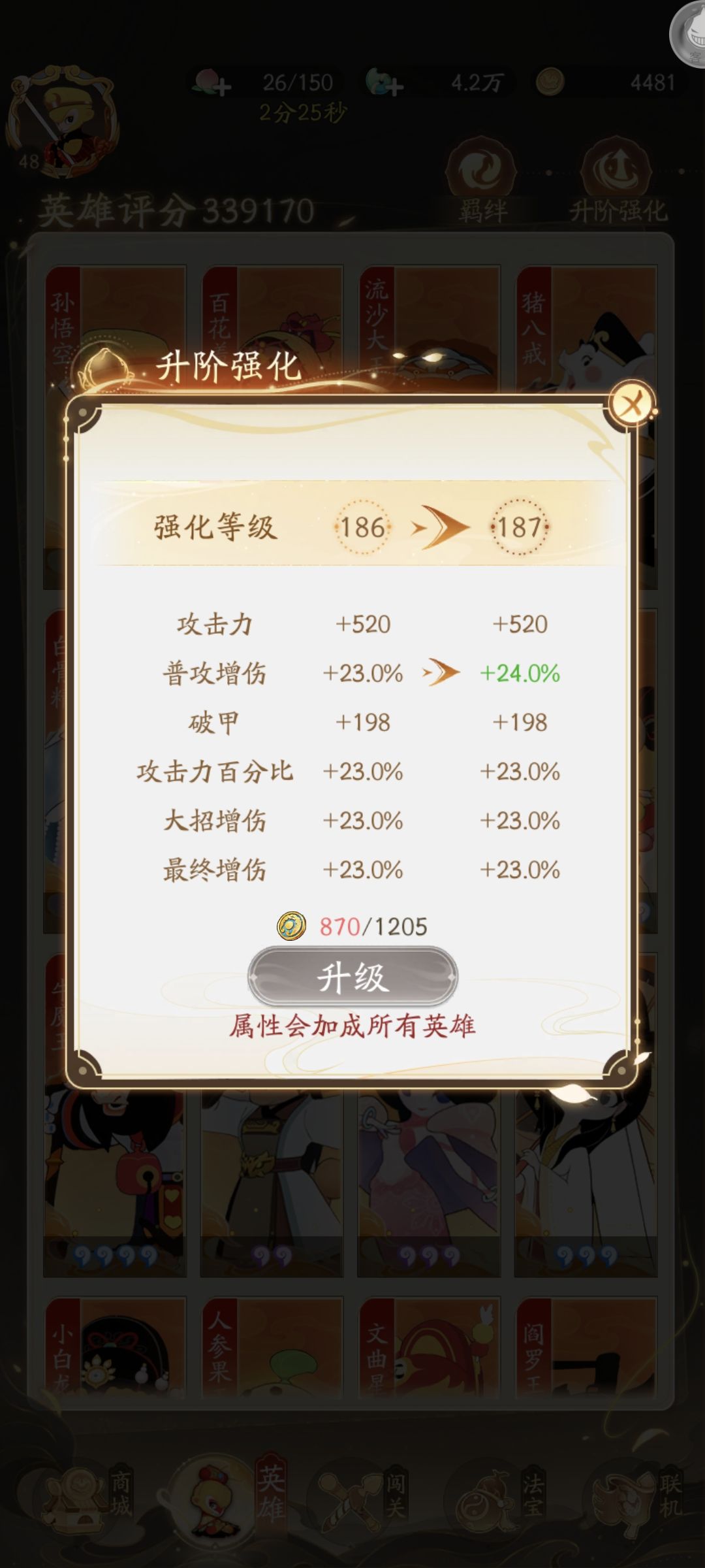 法宝招募:招募重复的法宝可提升法宝属性,其中最终增伤,法宝攻击百分比提升最大,法宝可凑出套装带来加成,法宝最高星级七星多余的会自动转换轮回币,升级法宝最缺金币。