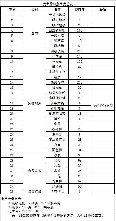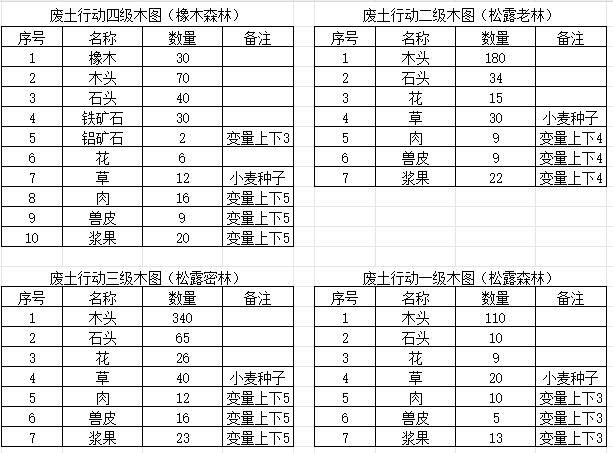废土行动繁荣度,食物效果,地图物资表。
