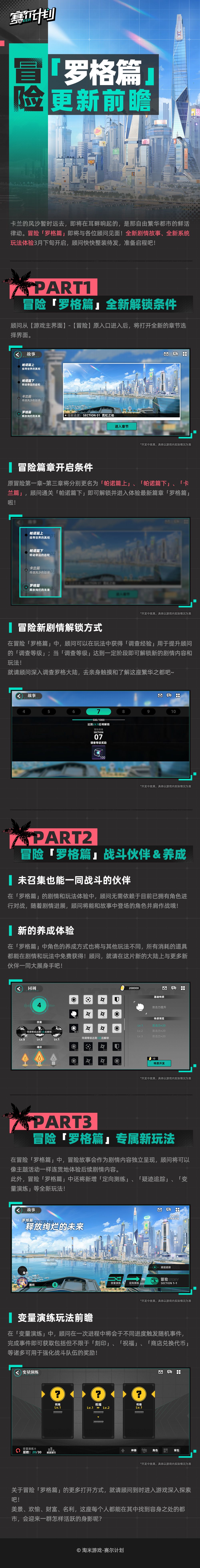 卡兰的风沙暂时远去,即将在耳畔响起的,是那自由繁华都市的鲜活律动。冒险「罗格篇」即将与各位顾问见面!全新剧情故事、全新系统玩法体验预计3月下旬开启,顾问快快整装待发,准备启程吧!