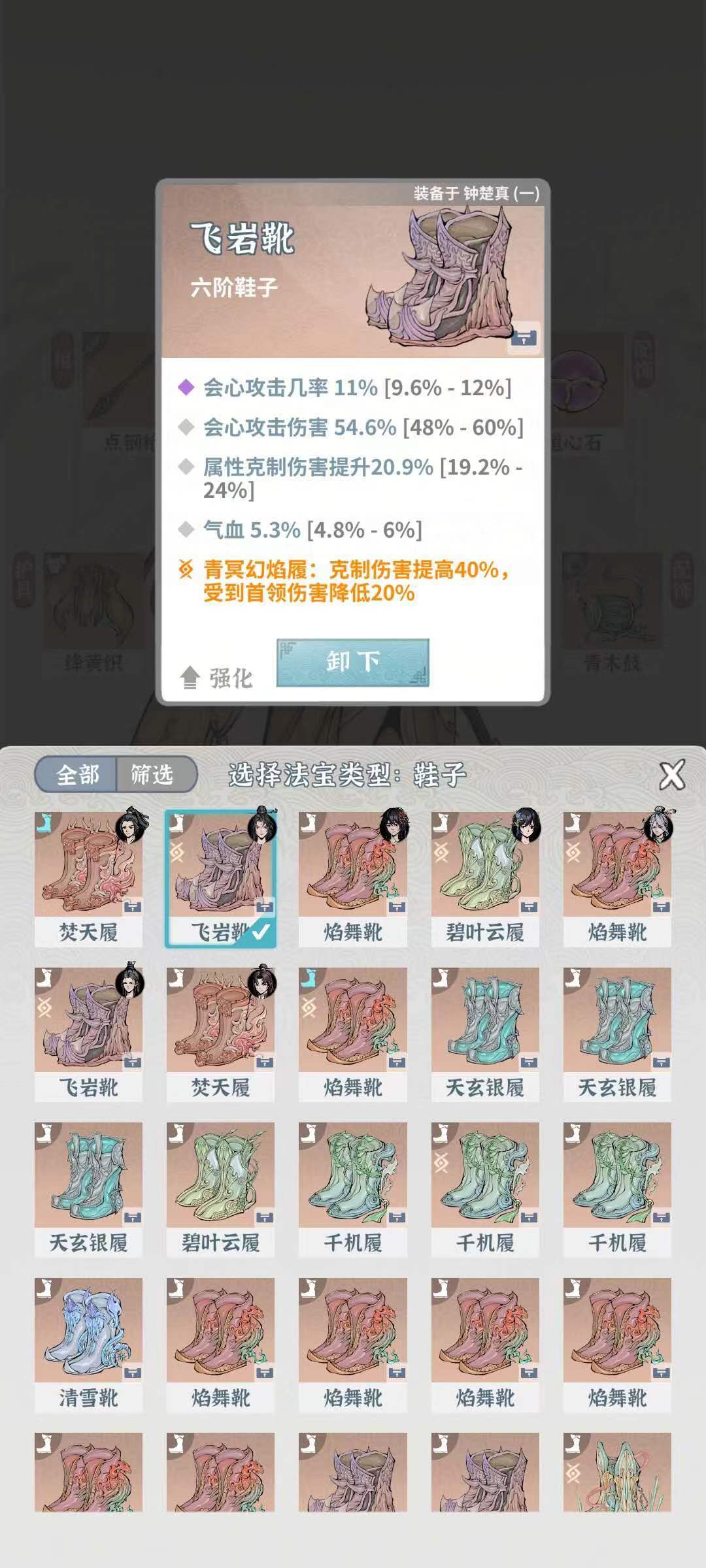 青冥幻焰履:克制伤害提高40%,受到首领伤害降低20%(提升克制伤害)