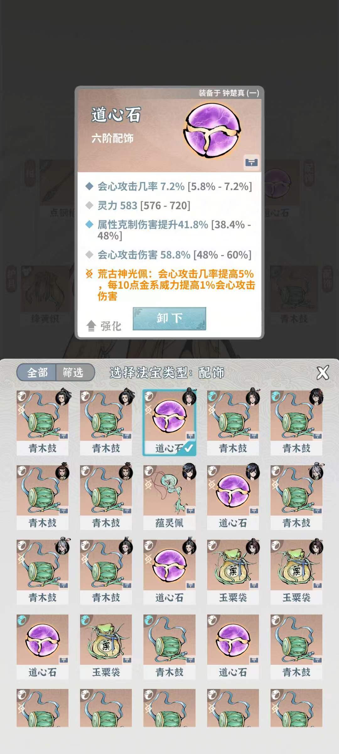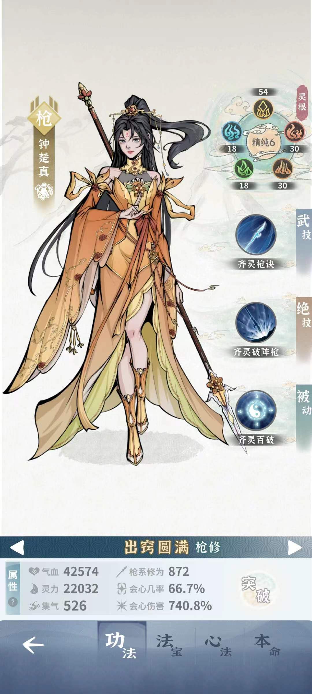 五行造化莲:提高武技和绝技的枪系威力发挥30%(大师姐只能带枪系的,目前我还没刷到)