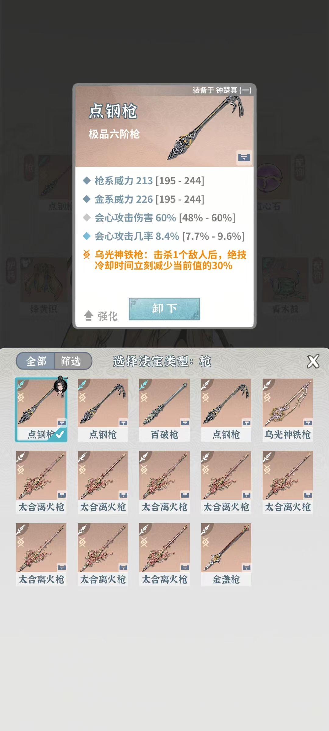 鸟光神铁枪:击杀一个敌人后,绝技冷却时间立刻减少当前值的30%(虽然被削但还是清杂爬塔神器)