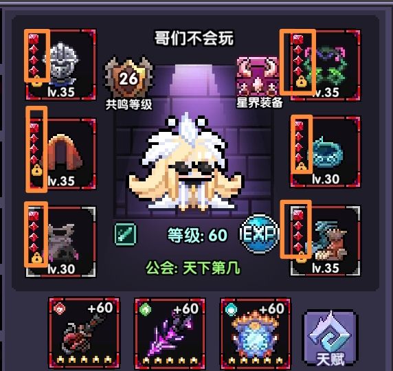 装备总共有六套(分别为头部,胸部,披风,项链,戒指,脚部),装备等级最高为35级,游戏内能获取的最高装备等级与自身小秘境通关最高层数挂钩(推到130多层就可以获取到35级暗金)