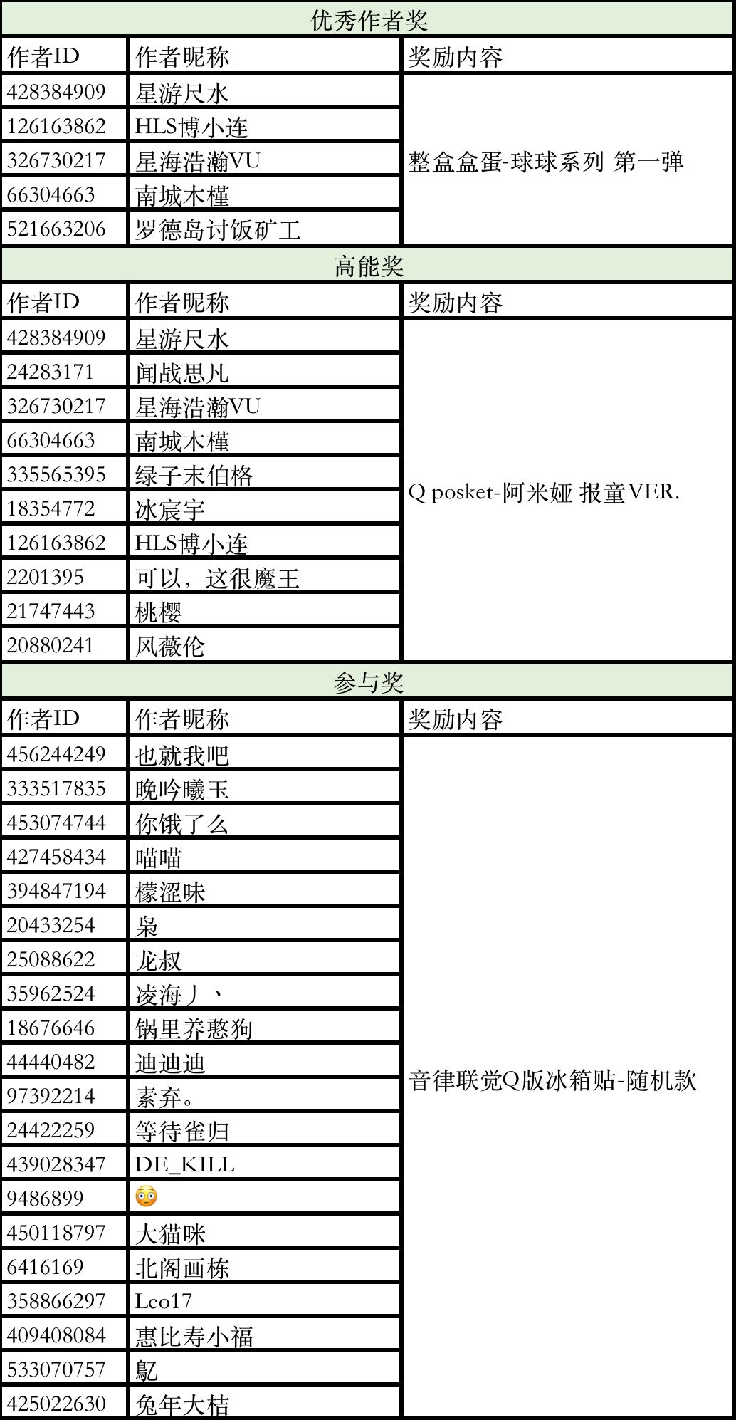 将从所有符合参与要求的投稿中,随机选取20位获得【音律联觉Q版冰箱贴-随机款】一份。获奖作者不与优秀作者奖、高能奖获奖人重复。
